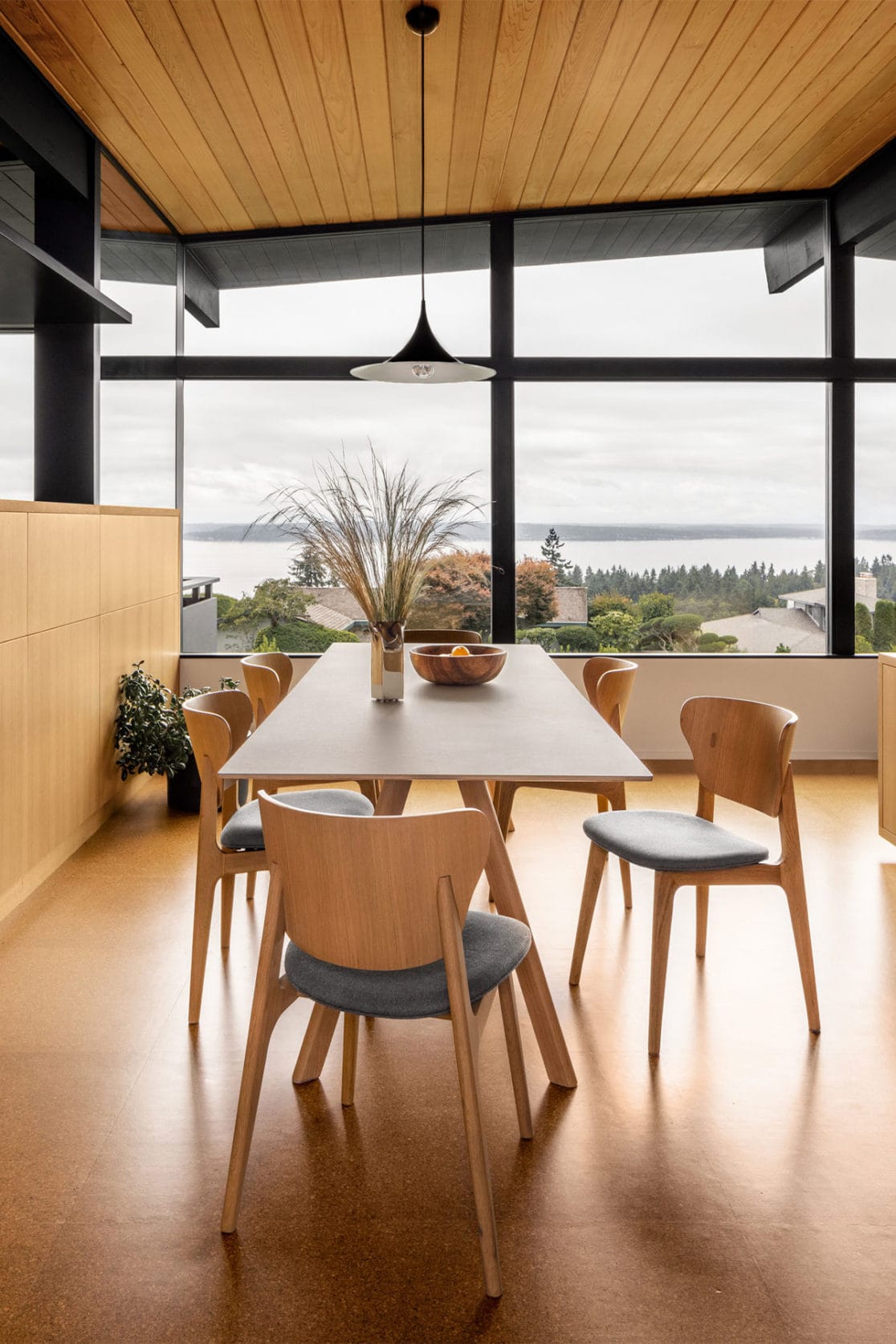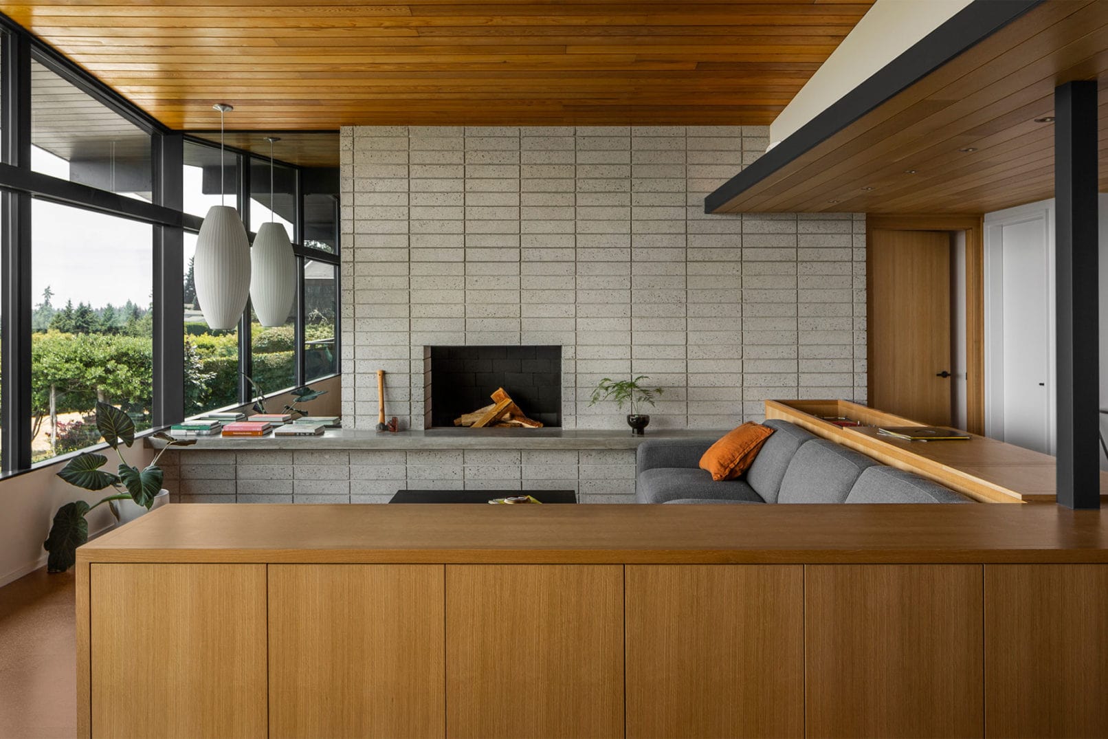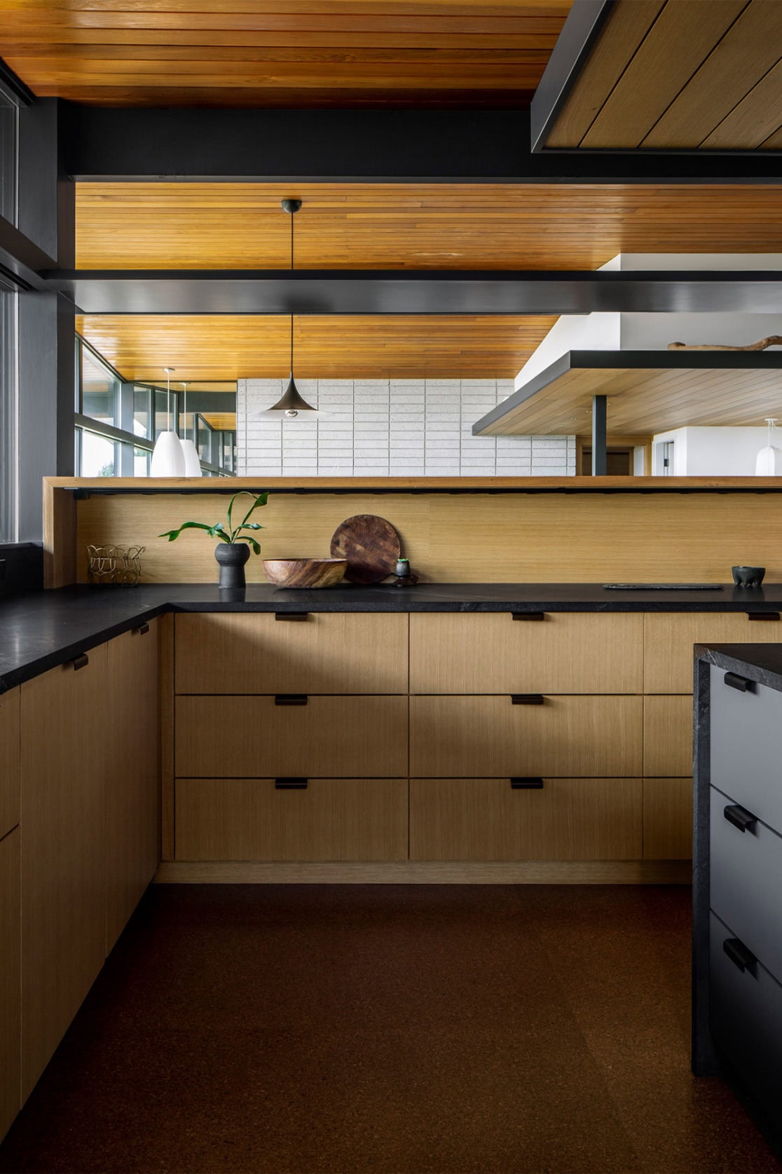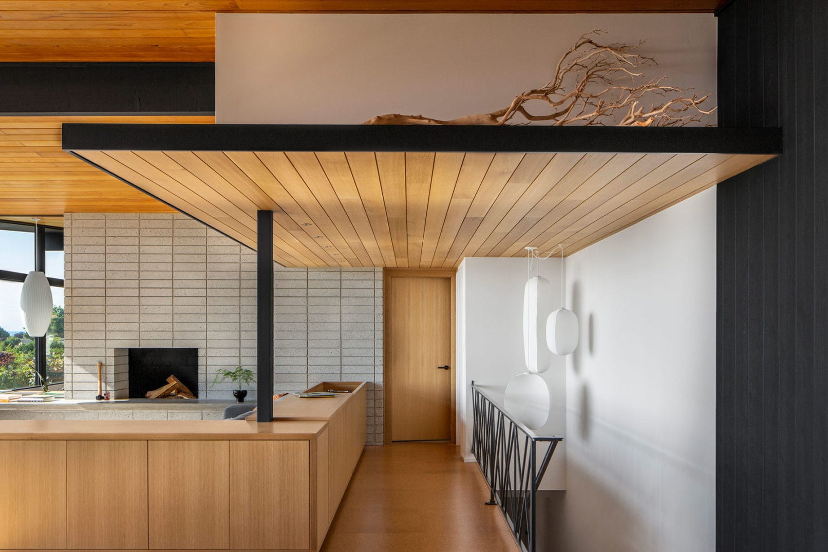 The design solution leveraged the house’s good bones — the existing post and beam structure and stopped in glazing — to create a unified main level where new elements are in harmony with the old. Although the structure was re-engineered to work with the revised floor plan, the post and beam structure was retained as a principle organizing system and integrated into the design. To replace the original casework, a low soffit was framed at the back of the living room to proportion the room while also defining the circulation space. In the living room, special attention was paid to the redesign of the fireplace which was faced with ground face CMU blocks and a cast concrete bench. To complete the space, low built-ins and a DJ station frame a large section facing the fireplace and view west. A limited palette of materials was used throughout the main level: cork flooring, rift sawn white oak paneling and casework, and white sheetrock walls are framed by wood structure and trim painted black to unify the space. As a nod to the past, the original natural slate tile and metal railing were preserved in the entryway. As a way of connecting the room to the view, large mirrors were integrated into the window wall to reflect the horizon into the living room.