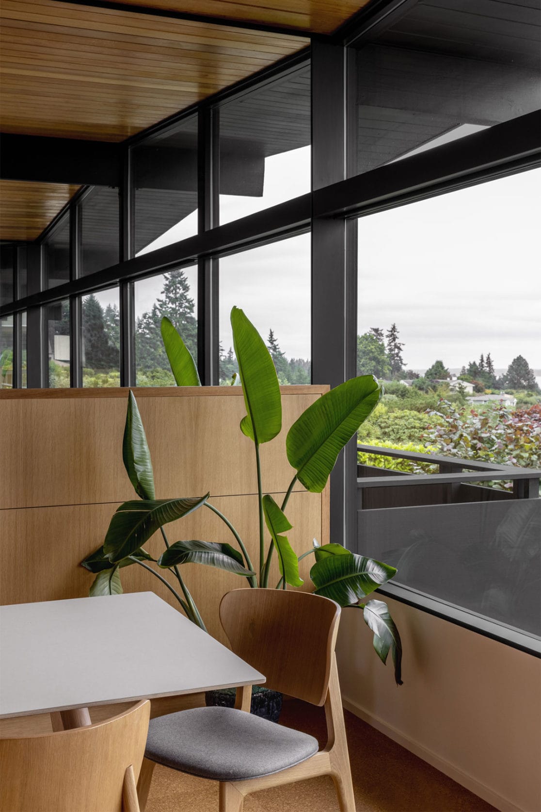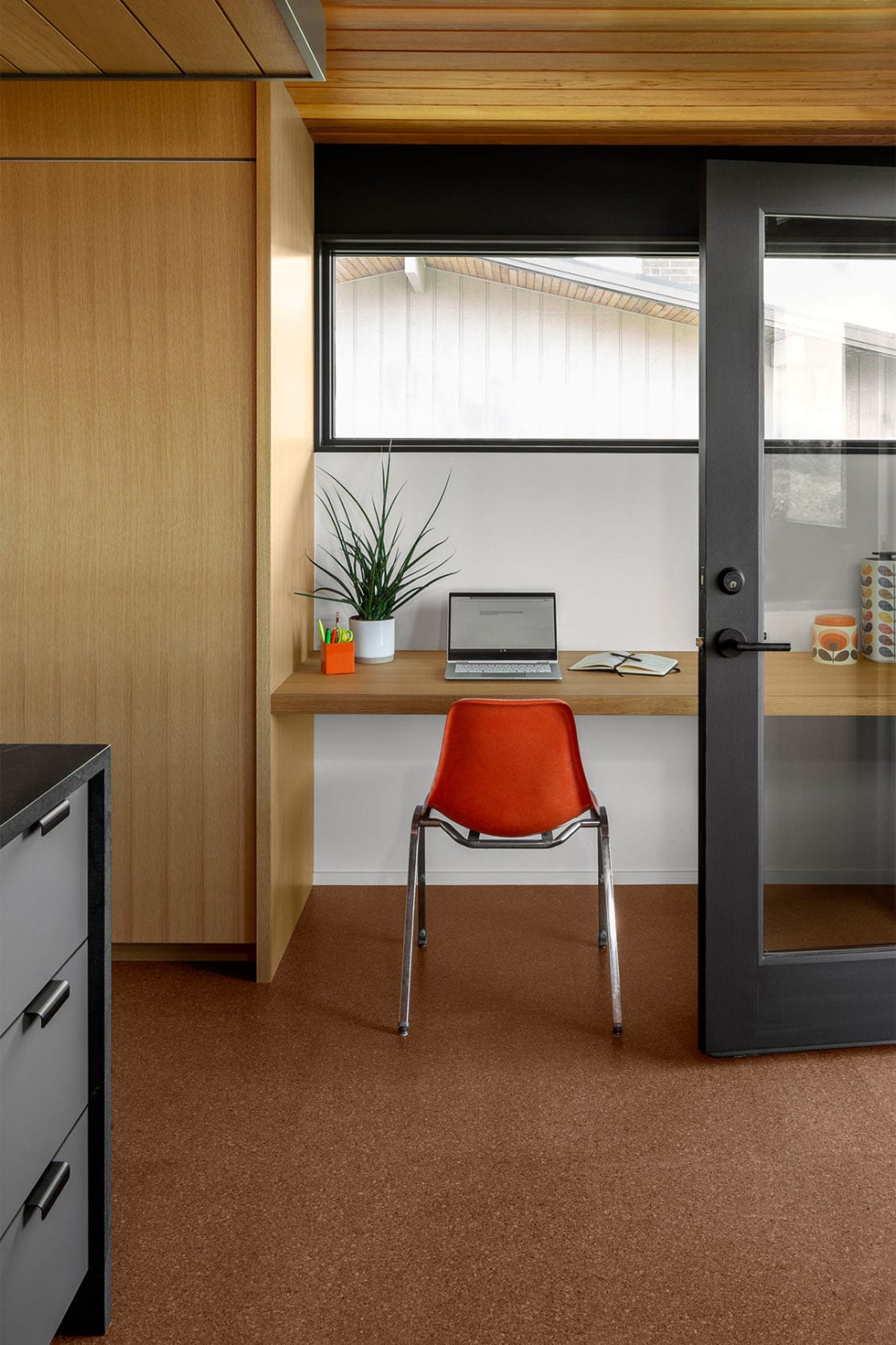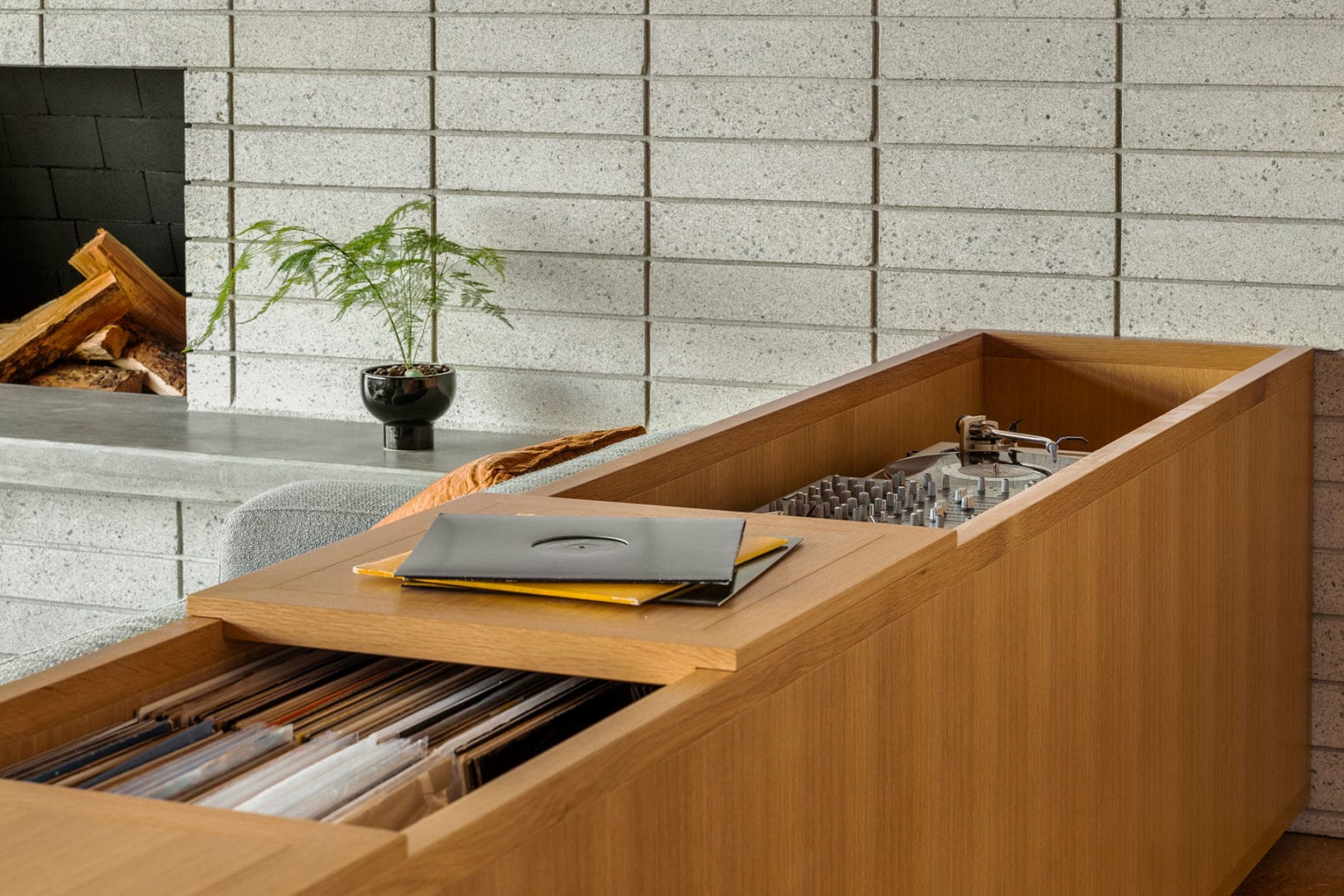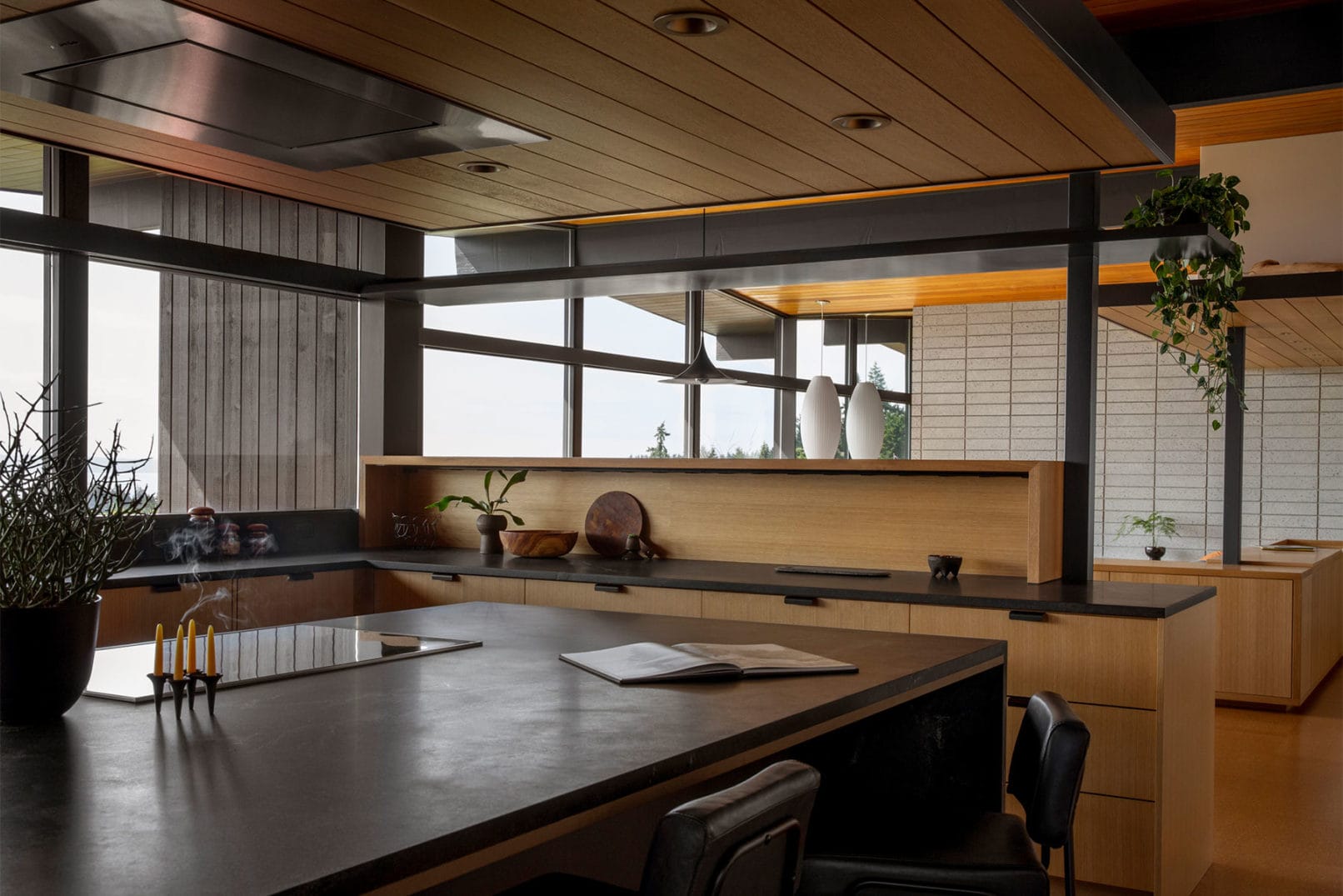 The design solution leveraged the house’s good bones — the existing post and beam structure and stopped in glazing — to create a unified main level where new elements are in harmony with the old. Although the structure was re-engineered to work with the revised floor plan, the post and beam structure was retained as a principle organizing system and integrated into the design. To replace the original casework, a low soffit was framed at the back of the living room to proportion the room while also defining the circulation space. In the living room, special attention was paid to the redesign of the fireplace which was faced with ground face CMU blocks and a cast concrete bench. To complete the space, low built-ins and a DJ station frame a large section facing the fireplace and view west. A limited palette of materials was used throughout the main level: cork flooring, rift sawn white oak paneling and casework, and white sheetrock walls are framed by wood structure and trim painted black to unify the space. As a nod to the past, the original natural slate tile and metal railing were preserved in the entryway. As a way of connecting the room to the view, large mirrors were integrated into the window wall to reflect the horizon into the living room.