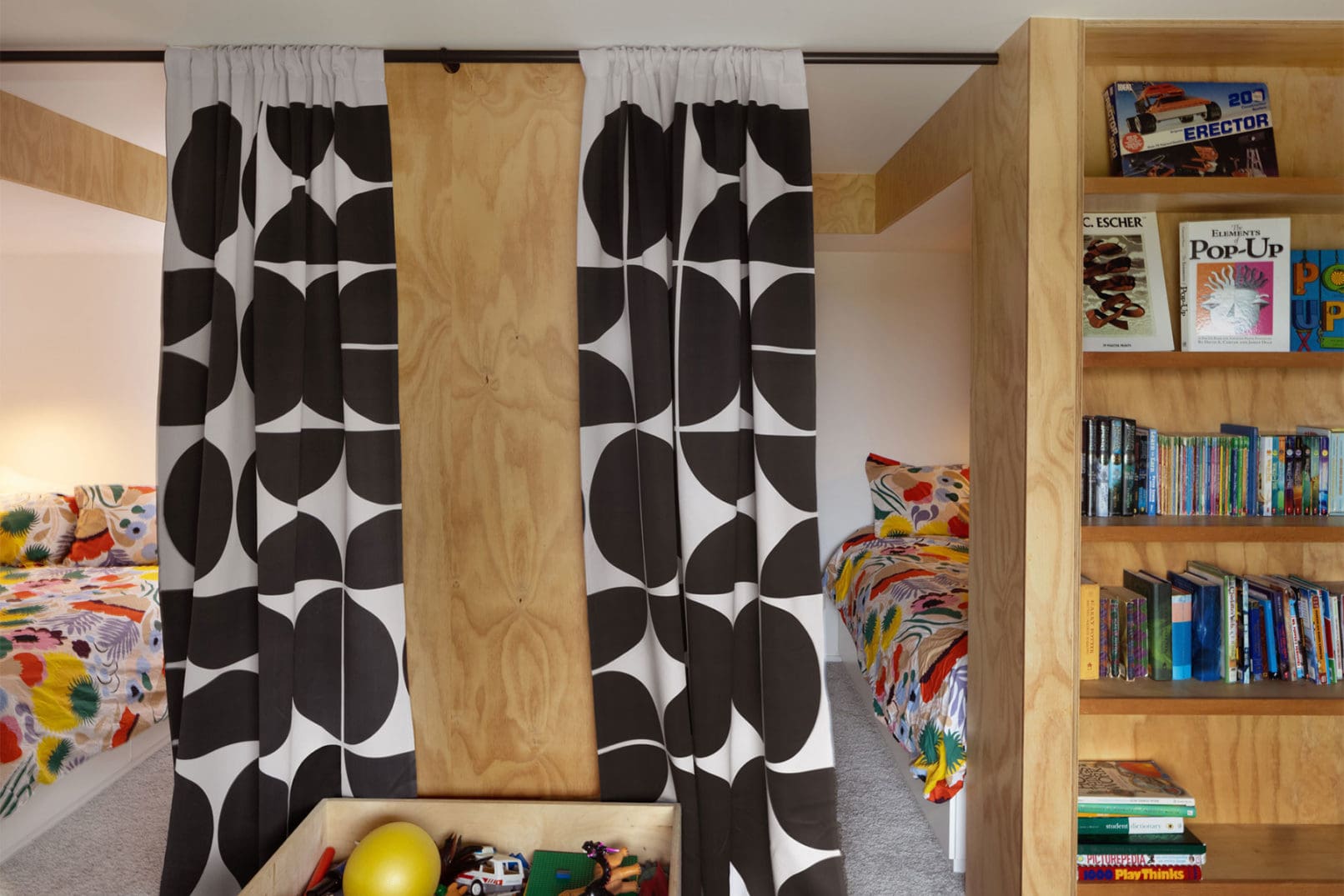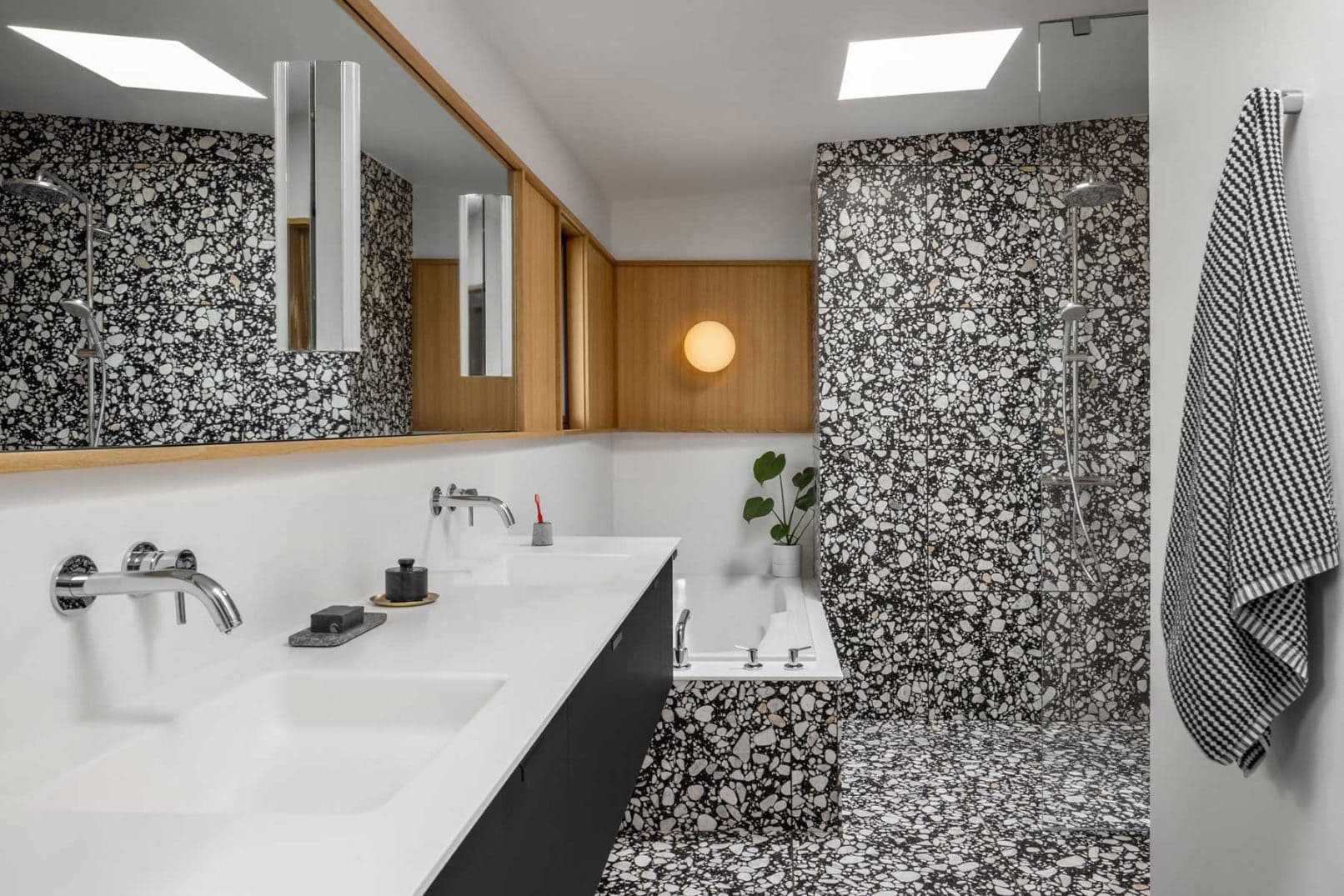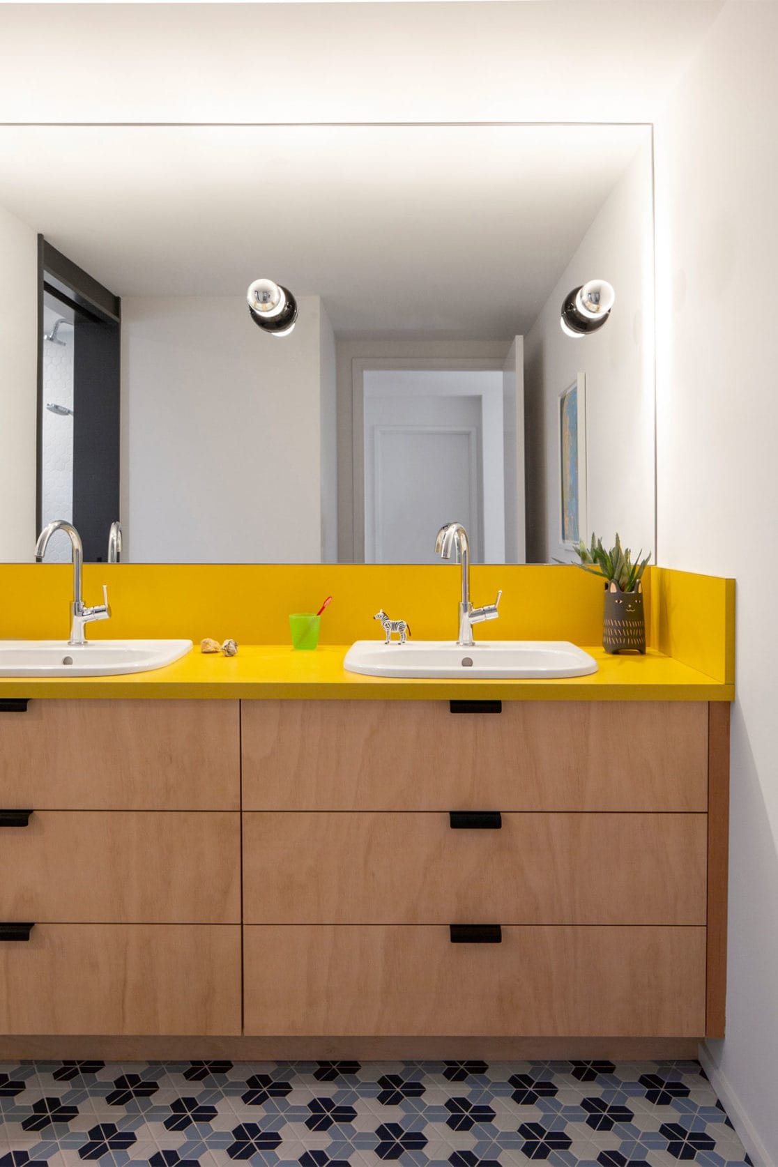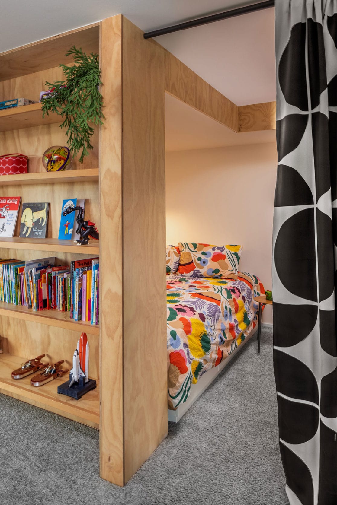 Unique experiences were created in other areas of the main level, from built-in entry benches to workspaces in the kitchen for kids to do their homework. In the master suite, grasscloth and oak paneling unify the suite, the center of which is a bathroom covered in black and white terrazzo tile. White Oak was used once again as a connecting datum behind the mirrors, wrapping around the tub to create a spot for an accent light and plant shelf. In the powder room, a mirror and coral dragon wallpaper play with patterns and reflections. On the lower floor, plywood bed cubbies were designed for two kids, leaving a shared work and play space. Plywood casework and yellow plam countertops were used in the kid-friendly bathroom.