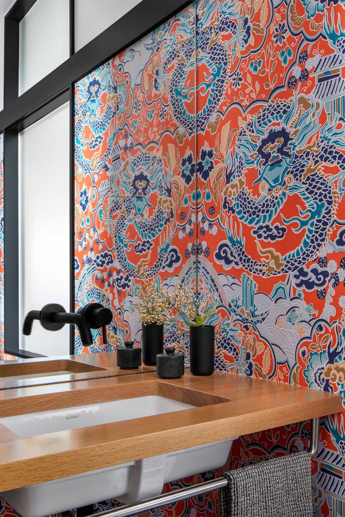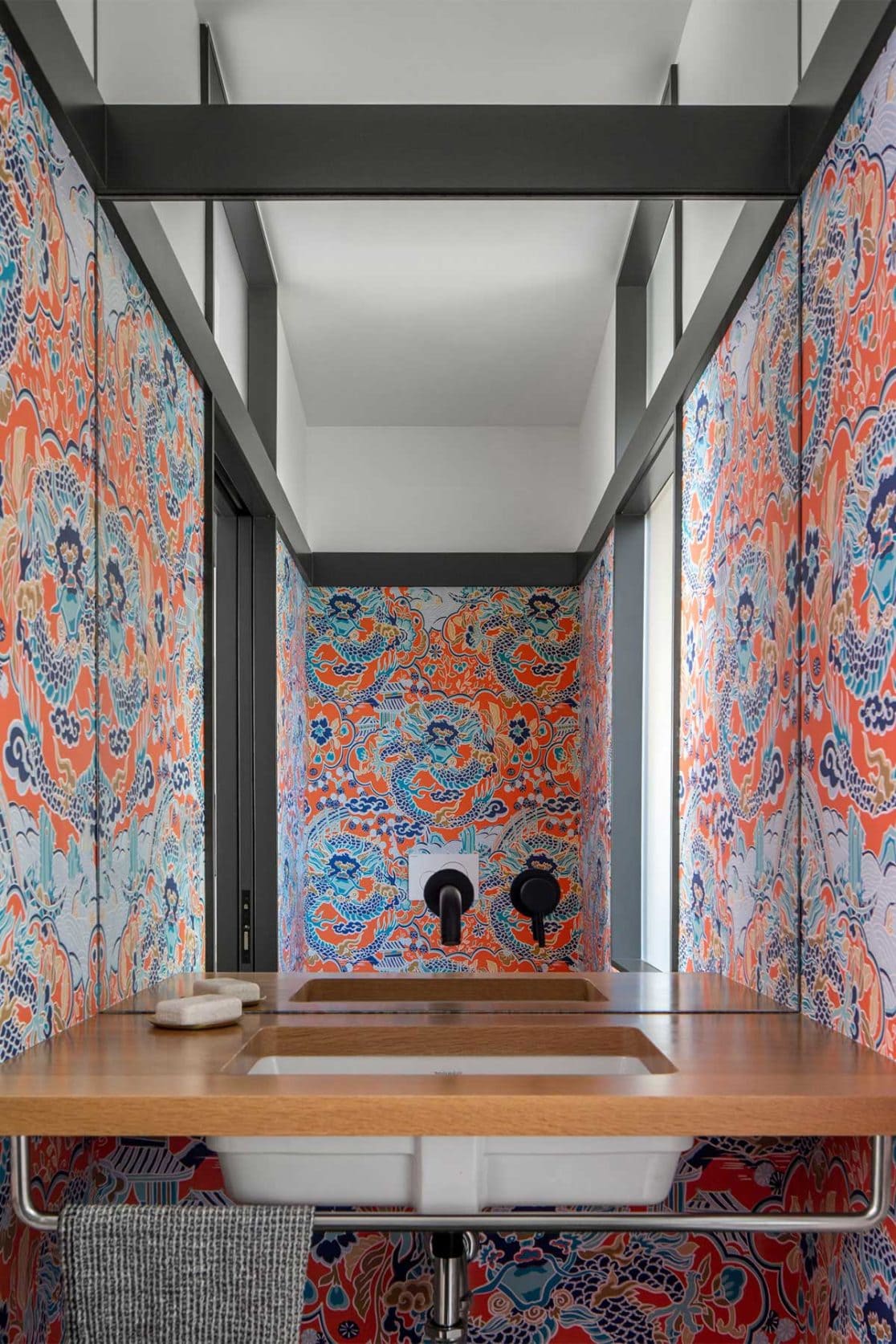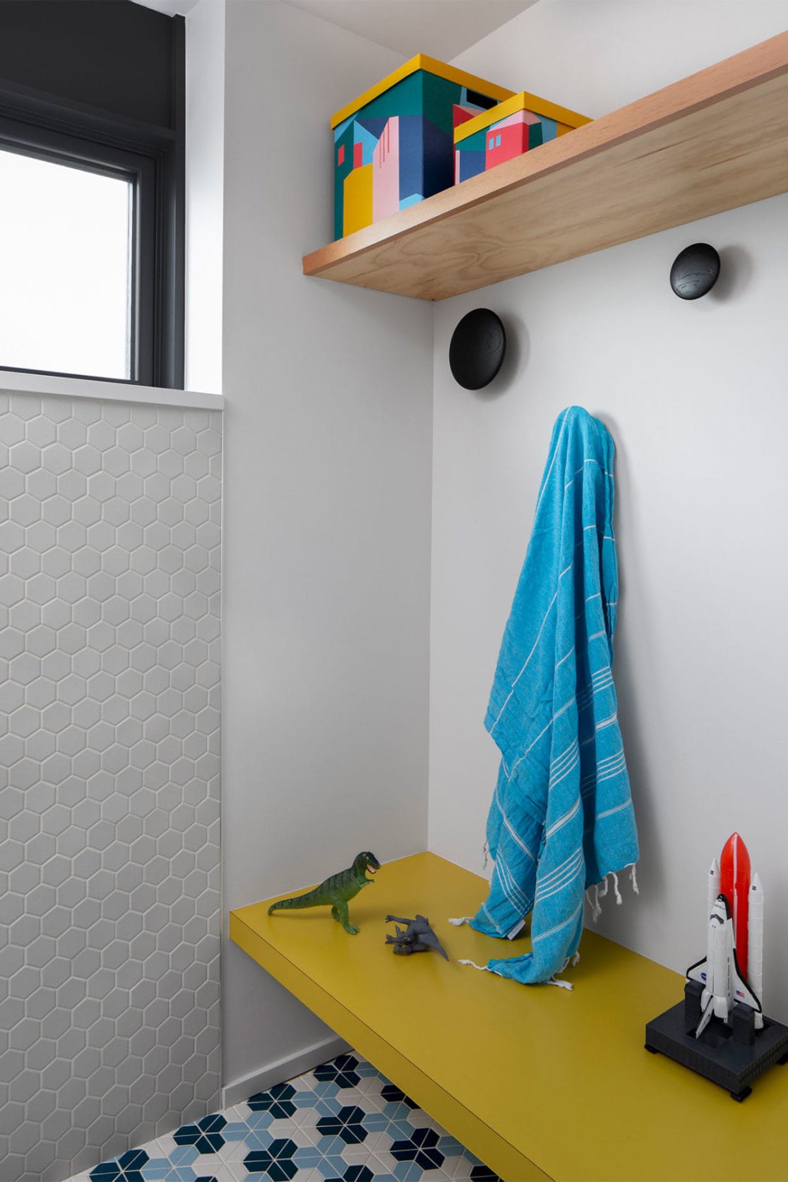 Unique experiences were created in other areas of the main level, from built-in entry benches to workspaces in the kitchen for kids to do their homework. In the master suite, grasscloth and oak paneling unify the suite, the center of which is a bathroom covered in black and white terrazzo tile. White Oak was used once again as a connecting datum behind the mirrors, wrapping around the tub to create a spot for an accent light and plant shelf. In the powder room, a mirror and coral dragon wallpaper play with patterns and reflections. On the lower floor, plywood bed cubbies were designed for two kids, leaving a shared work and play space. Plywood casework and yellow plam countertops were used in the kid-friendly bathroom.