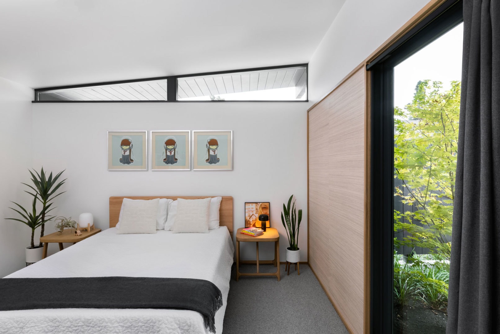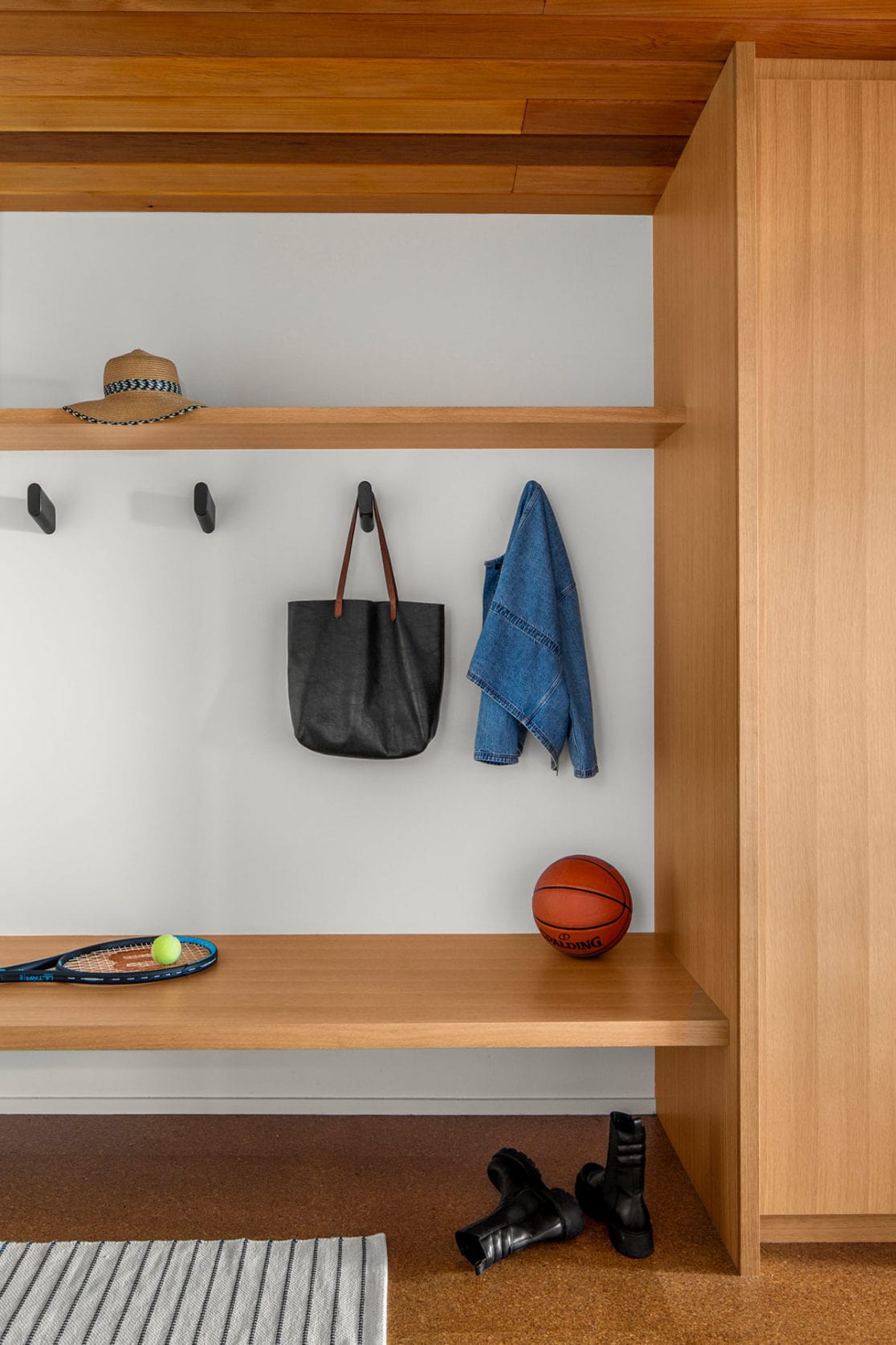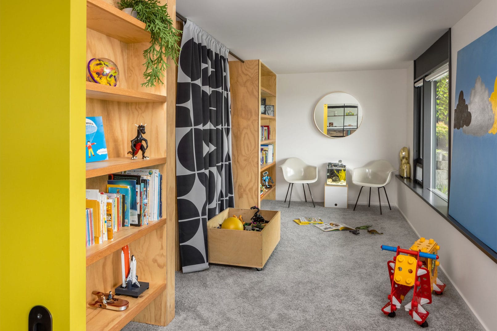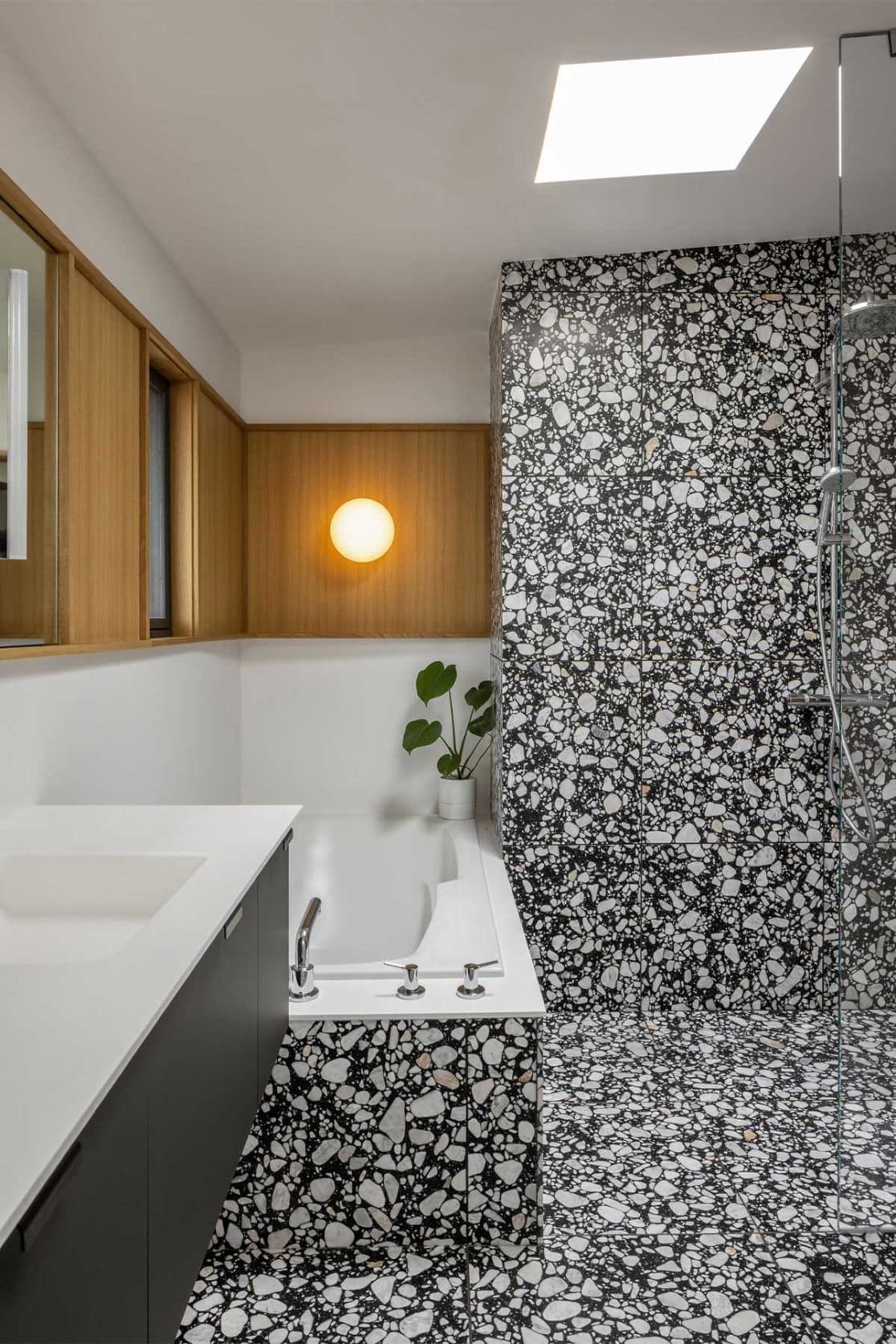 Unique experiences were created in other areas of the main level, from built-in entry benches to workspaces in the kitchen for kids to do their homework. In the master suite, grasscloth and oak paneling unify the suite, the center of which is a bathroom covered in black and white terrazzo tile. White Oak was used once again as a connecting datum behind the mirrors, wrapping around the tub to create a spot for an accent light and plant shelf. In the powder room, a mirror and coral dragon wallpaper play with patterns and reflections. On the lower floor, plywood bed cubbies were designed for two kids, leaving a shared work and play space. Plywood casework and yellow plam countertops were used in the kid-friendly bathroom.