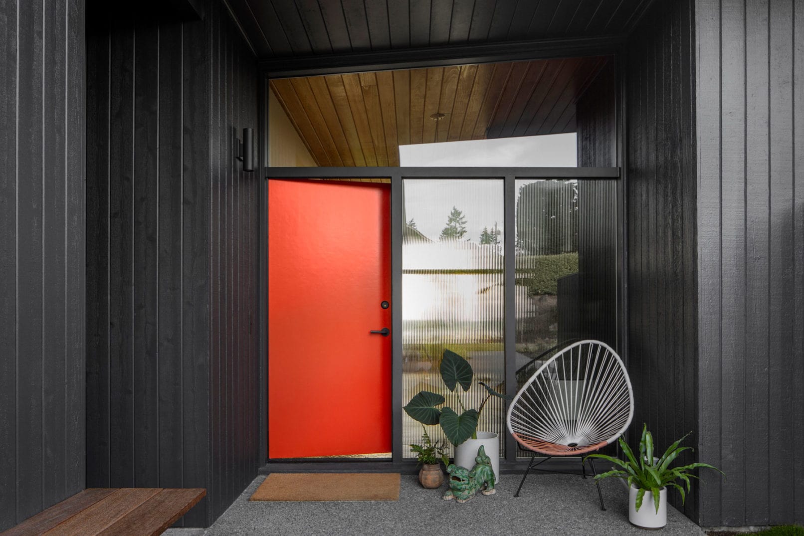 In addition to landscaping, new entry walls and a bench reframe the front door of the main entrance while screening the back door from view and concealing an exterior hot tub garden adjacent to the master bedroom. The ADA ramp that cut through the front lawn was removed for a firepit area, landscaping, and large lawn for family gatherings and neighborhood games.