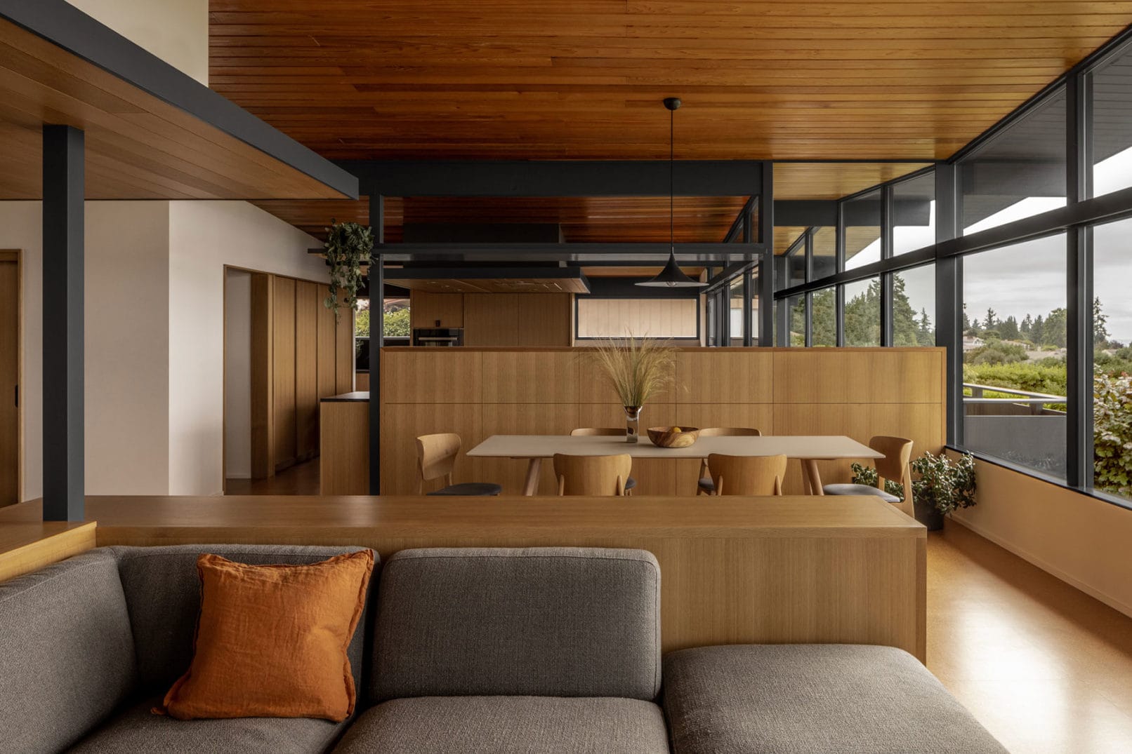 The house sits toward the back of a large lot with territorial views of the Puget Sound and the Olympic Peninsula. Although the house had good bones, modifications adapting the original layout for use as an adult living facility combined with deferred maintenance had tarnished the structure inside and out. The team took on the challenge of rejuvenating the home for a family of five and of restoring the aura of the Golden House.