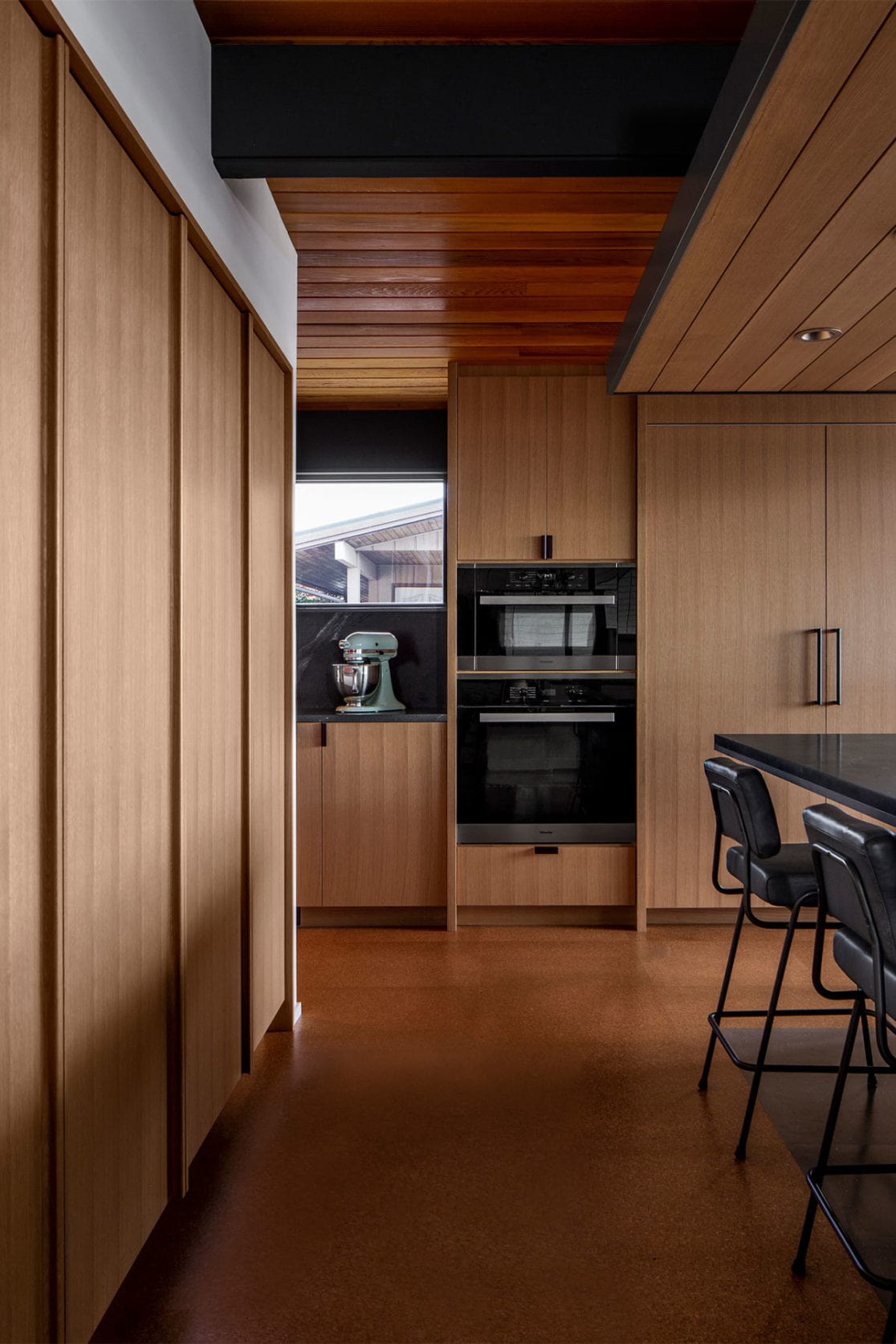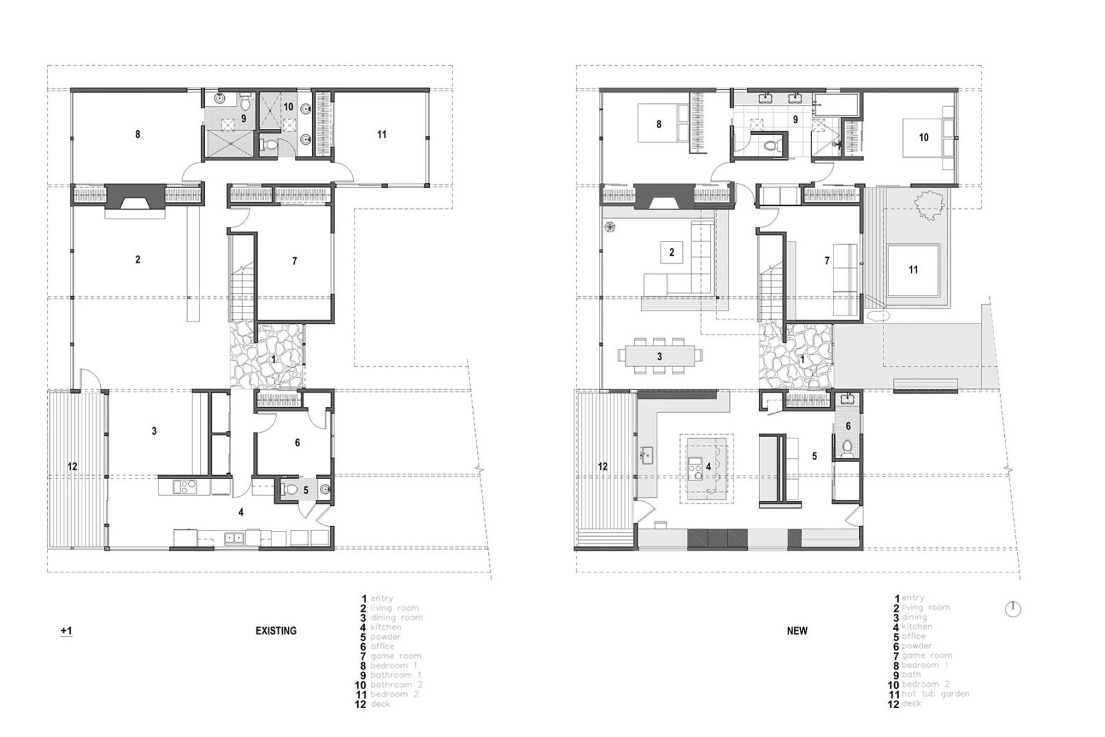 The primary aim of the project was to rehabilitate the structure from an adult care facility to a home for a family of five. To achieve this, the main level of the house needed to be transformed along with lower-level bedrooms and a bathroom. On the main level, walls and built-in casework were removed and program elements reshuffled. A buried galley kitchen was unearthed and re-formed around a central island overlooking dining and living spaces, allowing access to light, views, and the deck. Moving the kitchen made possible a new functional core consisting of a home office, powder room, back pantry, and coat closets, all with direct access to both the kitchen and carport. Space was not added but instead creatively re-apportioned to transform the kitchen and support spaces. Two main floor bedrooms and bathrooms were combined to form a master suite, while a third bedroom was repurposed as a TV and flex room.