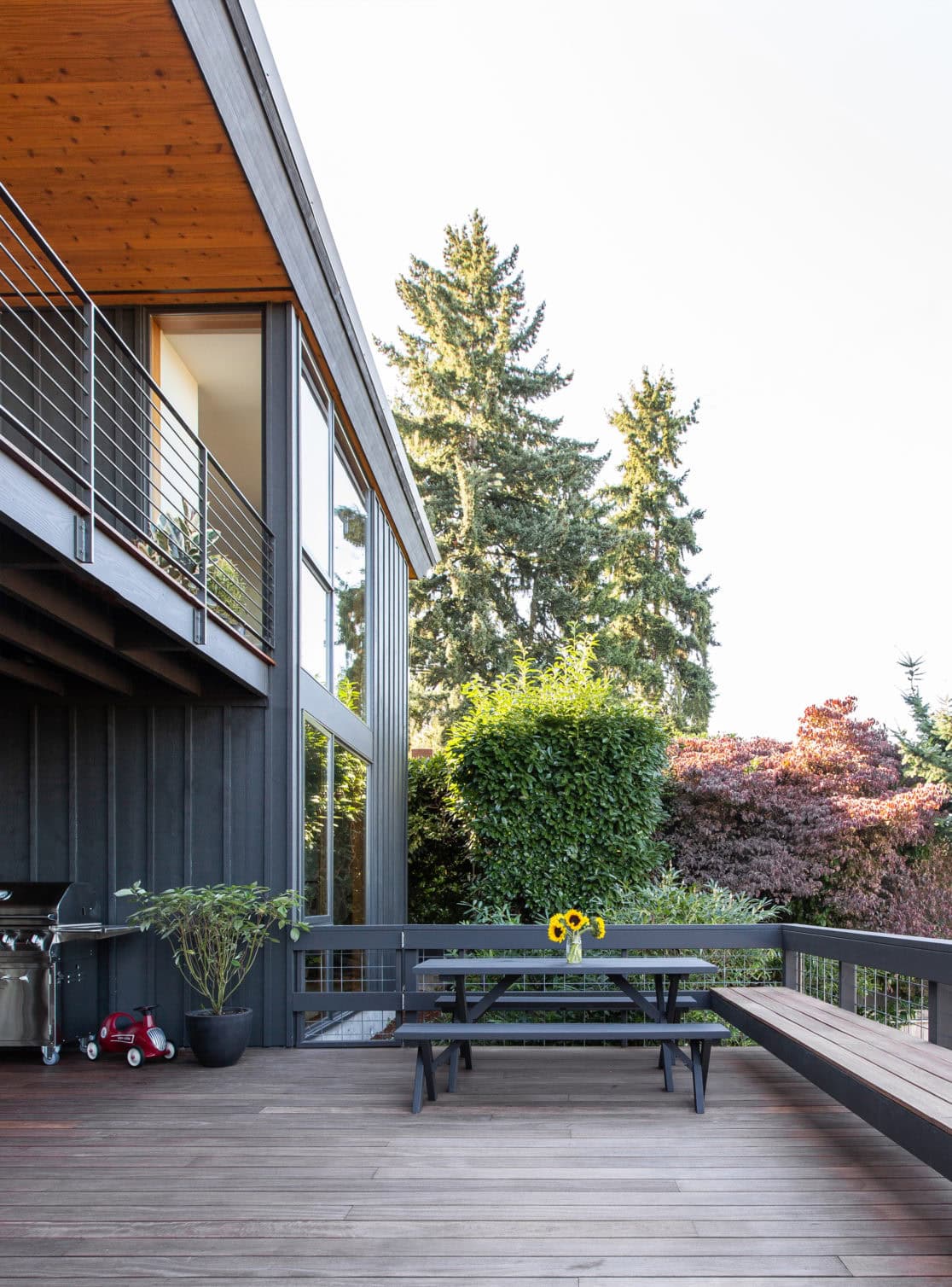 On the main level, SHED’s design solution removed the original fireplace to free the kitchen and create the scene for social interaction between spaces. In place of the chimney, a large peninsula set between building structure forms a new hearth, anchoring the living and dining areas in the open, flexible floor plan. SHED also simplified and reconfigured the narrow, L-shaped deck into a rectangle running parallel to the living and dining areas. Accessible via a large sliding door, this broad, flexible space extends the main level into an outdoor room. To bring natural light into the home, a skylight was placed over the peninsula, creating a bright space despite being surrounded by both the carport and an adjacent house.