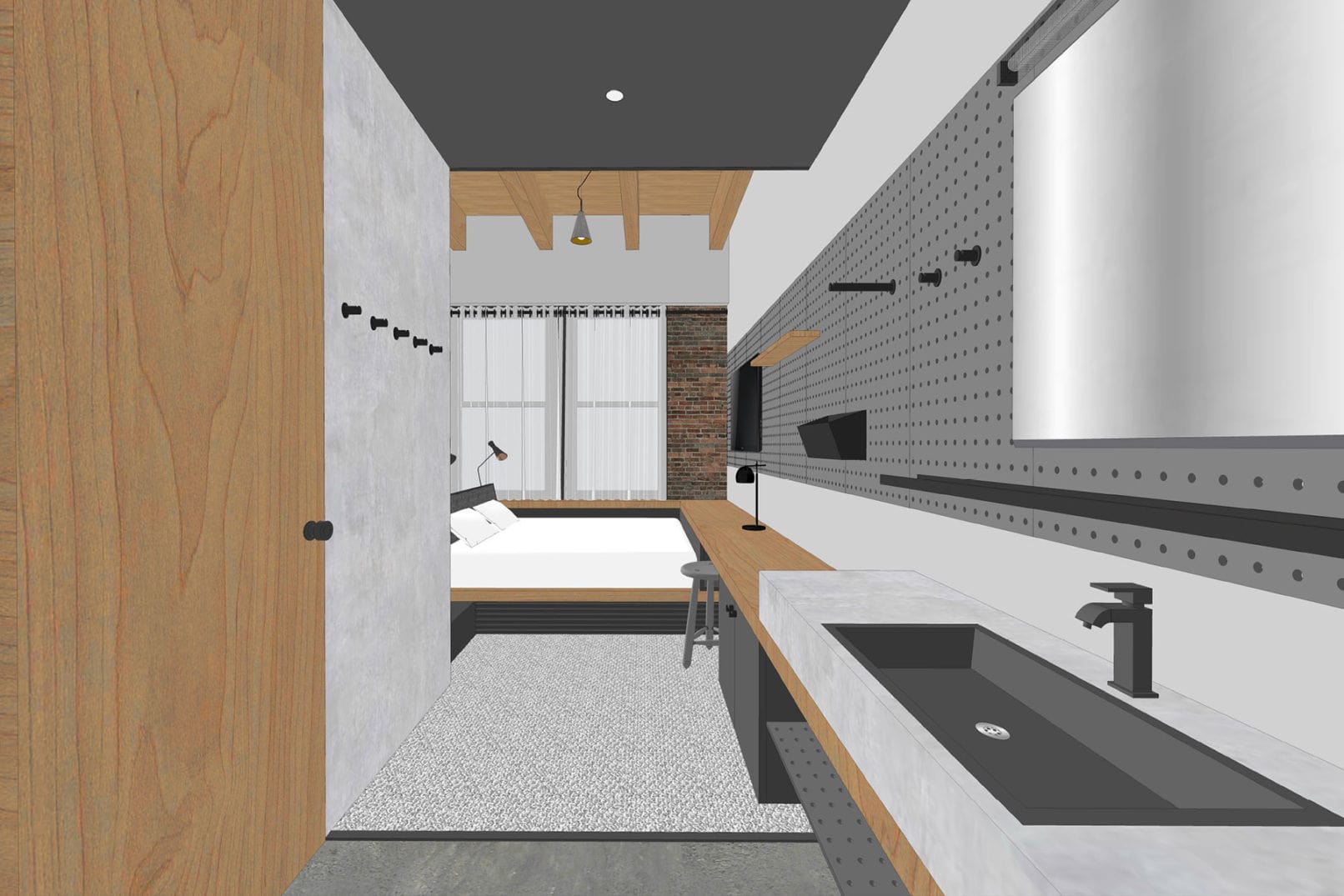 The ground floor and first floor will be a split-level towering timber structure that houses the hotel restaurant, bar, and coffee shop in an open concept plan with a range of seating and dining options. The intention is to create a relaxed environment where food and drinks can be served anywhere in the dining or informal seating areas—ideal for people working remotely, casual meetings and local diners. The rooftop will have additional hotel amenities including rentable meeting space and a rooftop bar with Pioneer Square and city views.