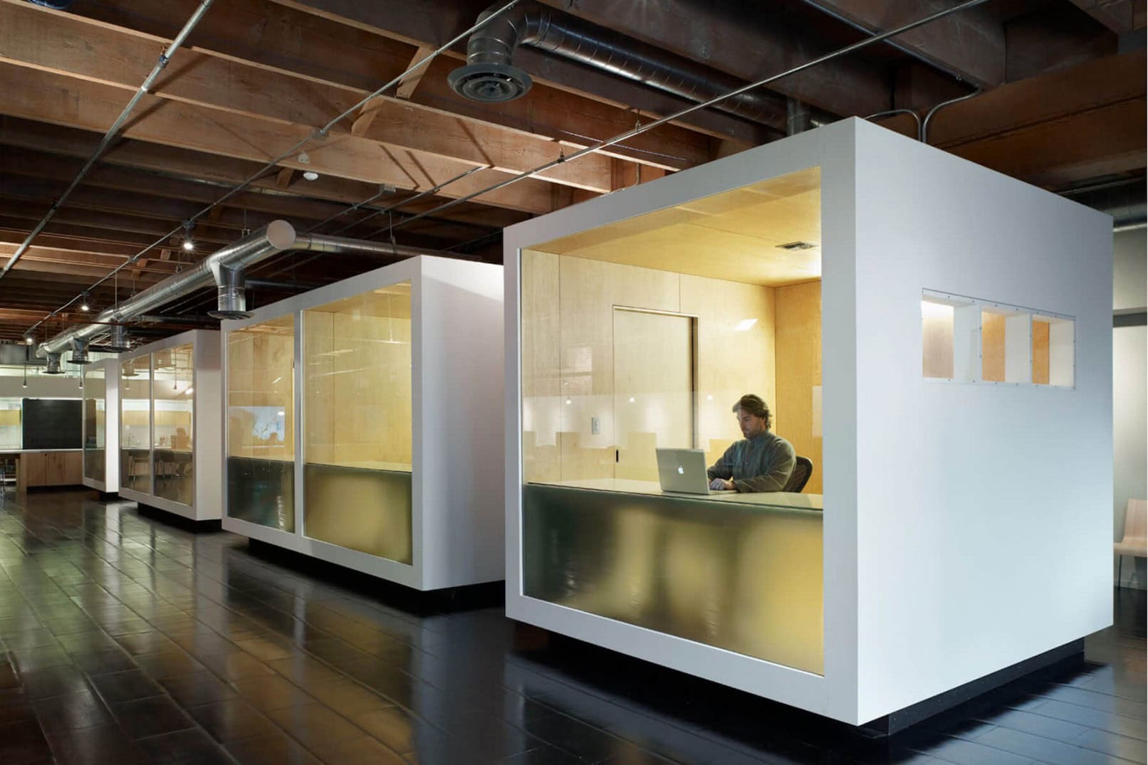 The reimagined space features a modern open office design with cube shaped quiet spaces mixed with original brick details.