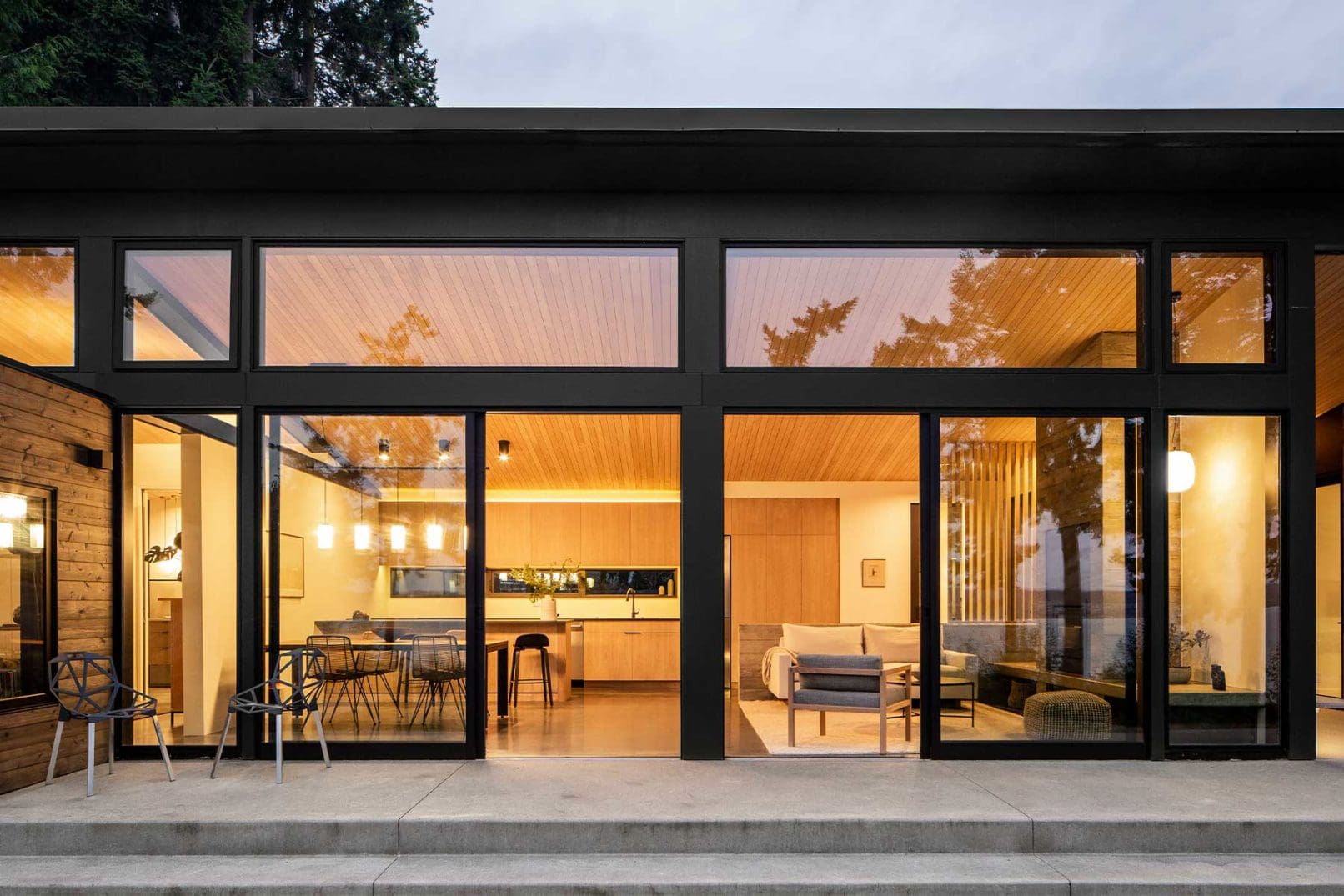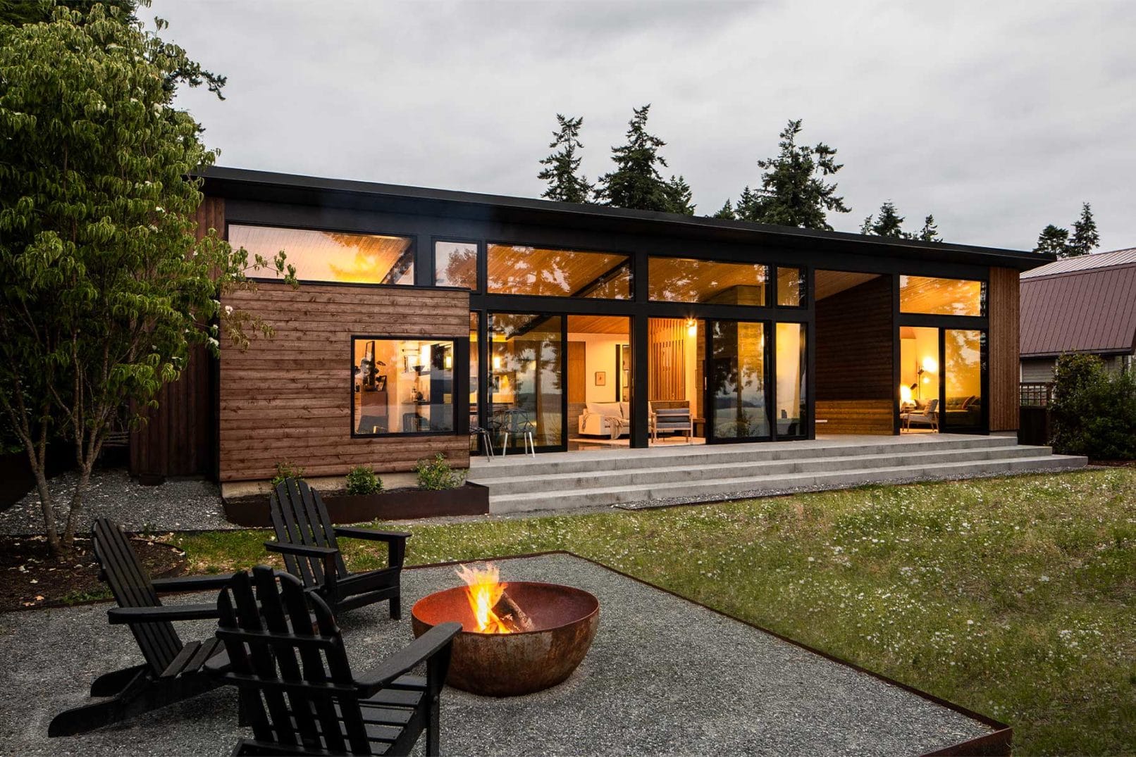 Perched on a high bank waterfront lot on Whidbey Island, a common shed roof shelters a 915 square foot living area, a 281 square foot flex space, and a “dogtrot” — a sheltered breezeway with views of Mt Baker and Saratoga Passage.