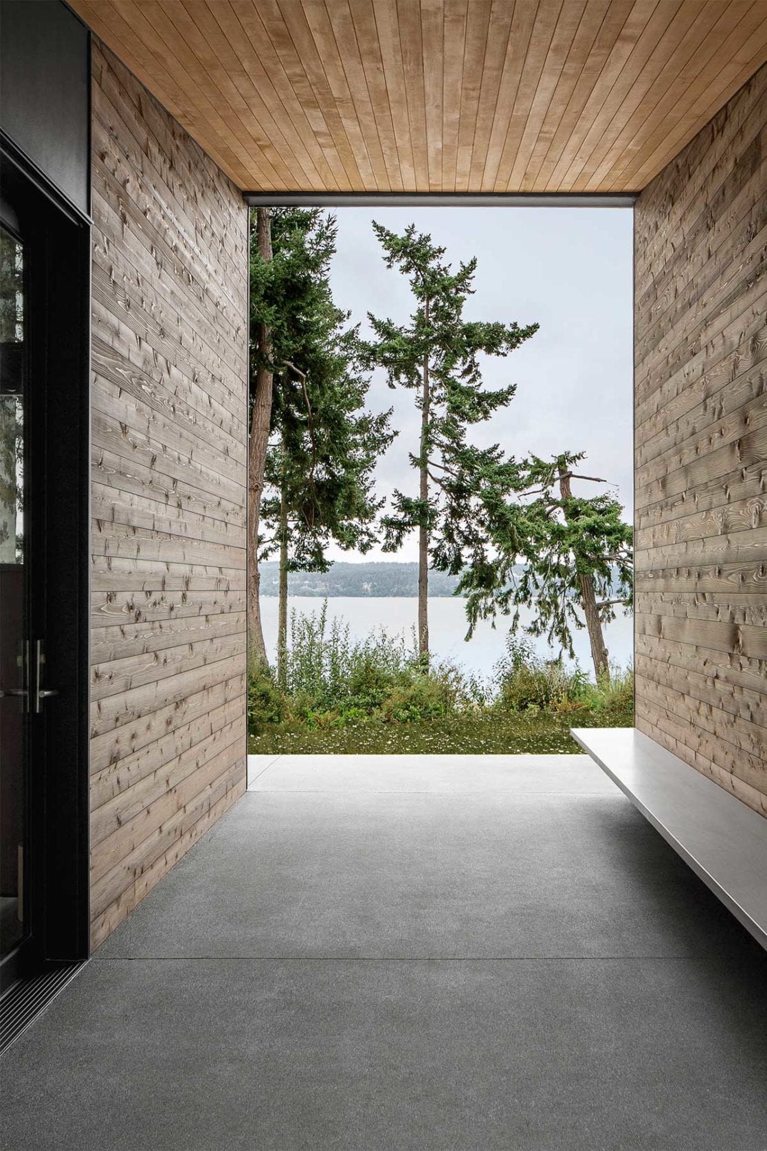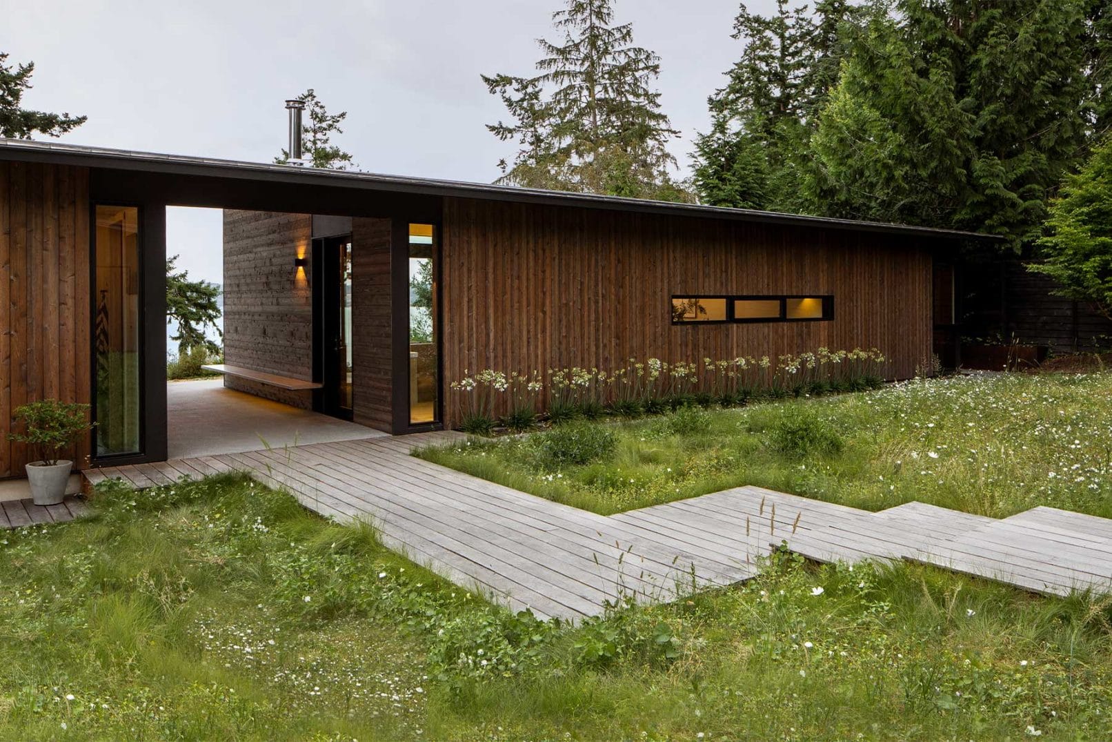 The site is a narrow, east-west oriented high bank waterfront lot overlooking Saratoga Passage with views to Mt Baker and the Cascade Mountains. Flanked by neighbors to the north and south, with a busy rural road to the west, the design challenge of the site was to create privacy while taking in the territorial views. To accomplish this, the design team located the house west of an existing garage to create a forecourt that serves as a rain garden and landscaped buffer to the parking area and road. The facade of the house is protective of the interior with narrow vertical and horizontal slot windows cut into the stained cedar siding. A wood boardwalk leads to the breezeway, which gives access to the living and flex rooms and allows passage through to the waterside of the house.