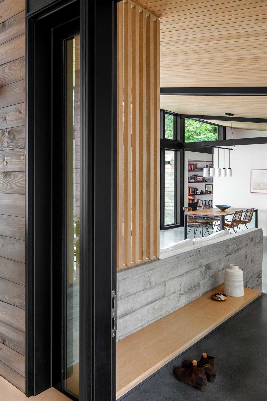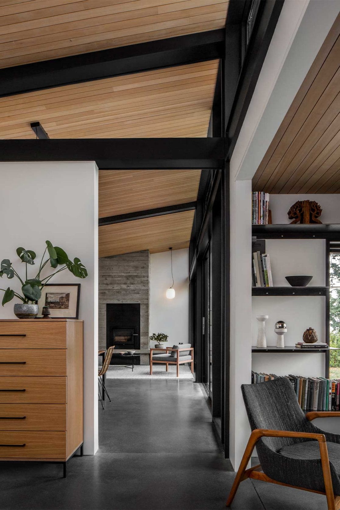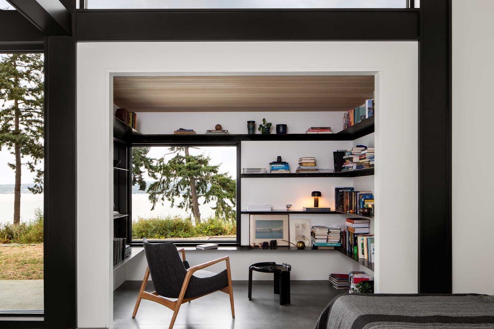 The elemental building type solves the design problem in a quiet, pragmatic way. The building is comprised of three parts: a concrete plinth that cascades down to the site as steps, wood-framed volumes dimensioned by timber bents, and a large shed roof inclined to the view. An exterior bench continues into the entry along a concrete wall while careful detailing of windows and doors connects the interior of the house to the outside. The owners were instrumental in the selection of interior finishes and fixtures, in particular the design of a concrete and steel fireplace and bench as well as the reading area’s steel shelving. Utilizing a limited material palette, the Whidbey Dogtrot is a house that seeks to amplify the experience of living on the site through an economy of means.
