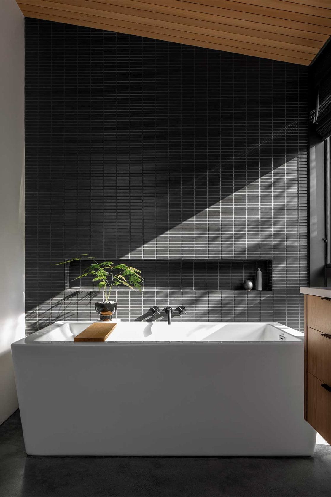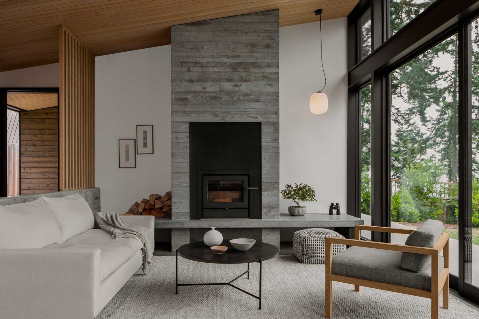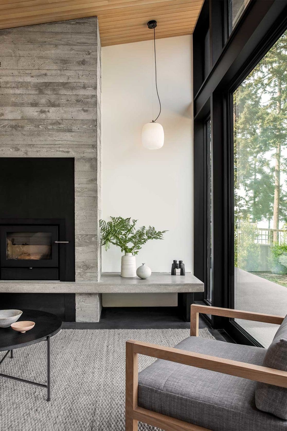 The elemental building type solves the design problem in a quiet, pragmatic way. The building is comprised of three parts: a concrete plinth that cascades down to the site as steps, wood-framed volumes dimensioned by timber bents, and a large shed roof inclined to the view. An exterior bench continues into the entry along a concrete wall while careful detailing of windows and doors connects the interior of the house to the outside. The owners were instrumental in the selection of interior finishes and fixtures, in particular the design of a concrete and steel fireplace and bench as well as the reading area’s steel shelving. Utilizing a limited material palette, the Whidbey Dogtrot is a house that seeks to amplify the experience of living on the site through an economy of means.