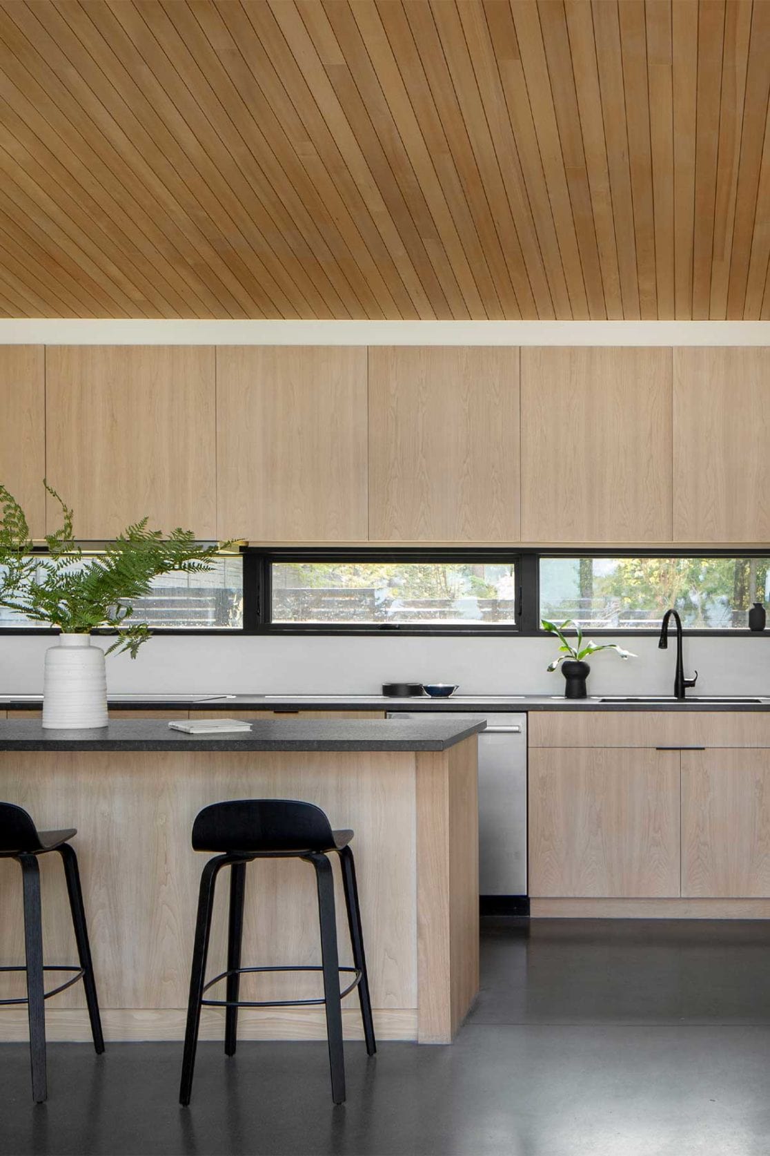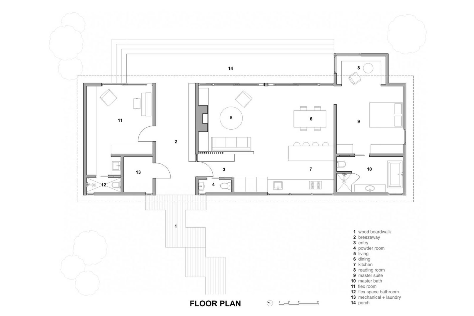 For clients transitioning into retirement, the design challenge was to create a compact house for economy of operation, ease of maintenance, and a space that maximized the natural beauty of the site. In addition, the house needed space for guests, visiting adult children, hobbies, music, and a home office. The dogtrot form was used as a way to organize these programmatic needs into two sections — one with the master suite, living, kitchen, and dining area, and the other as a flex space. Both sections live under one roof while maintaining a direct circulation to the water. The form anchors the building to the site by defining a boundary between the street and bluff side yards while framing a view between them. The house is a singular, orderly form with a separated reading room bump-out on the side.