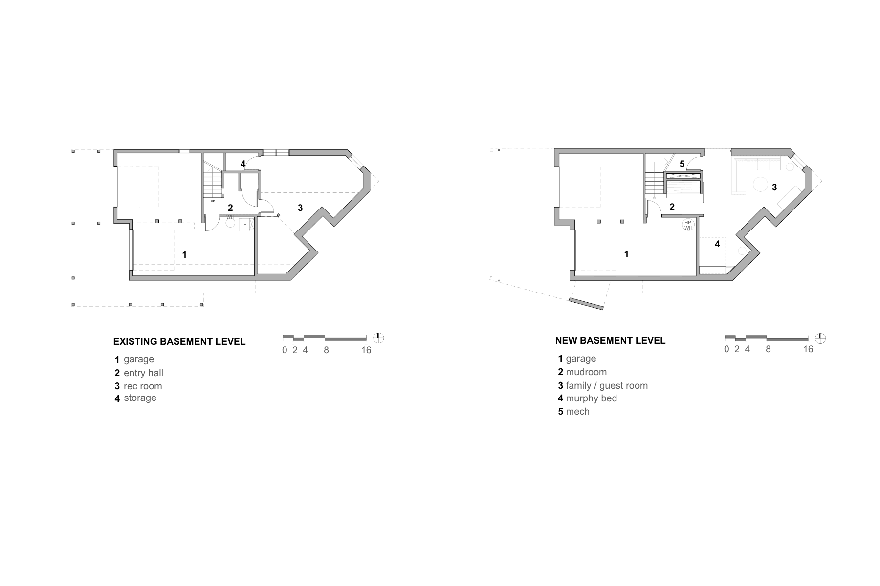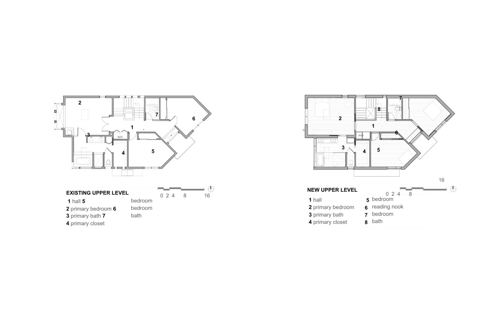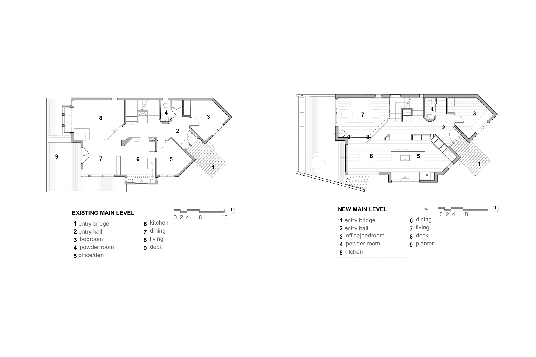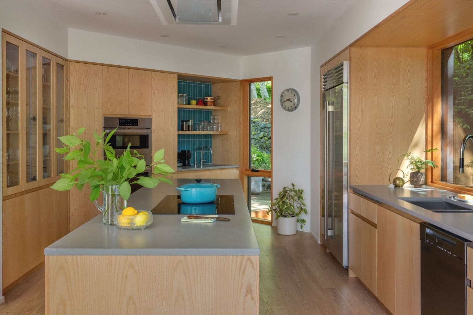 The kitchen was expanded and reoriented to the west by removing the small den near the entry and adding a small bump-out. The result is a spacious and functioning hub with a central island and open connections to adjacent living spaces. Floor-to-ceiling bifold and sliding doors flood the interior with light and create seamless access to the redesigned west-facing deck, enhancing indoor-outdoor living.