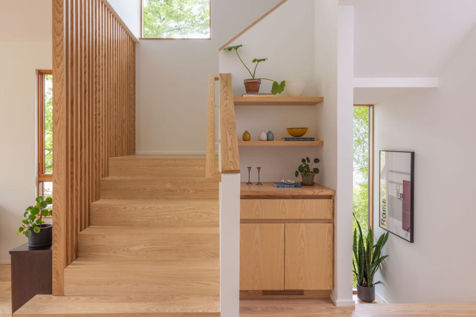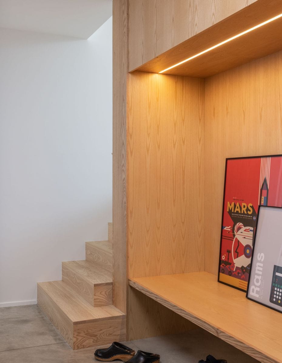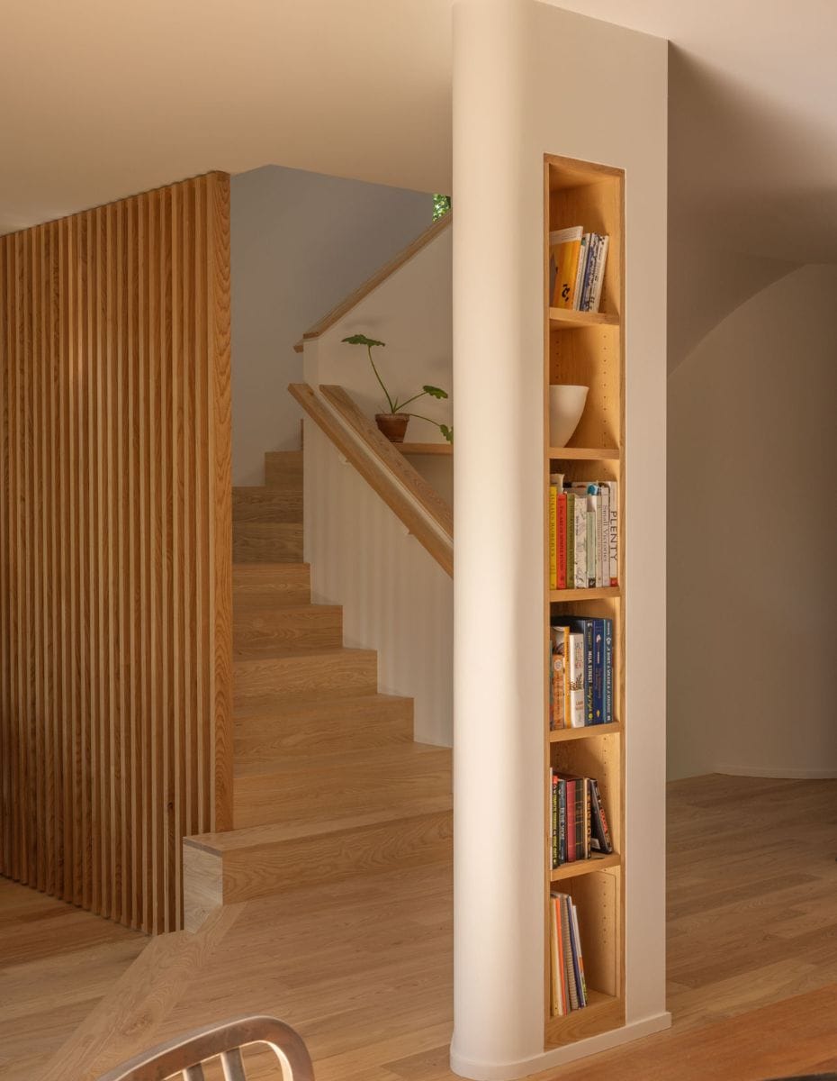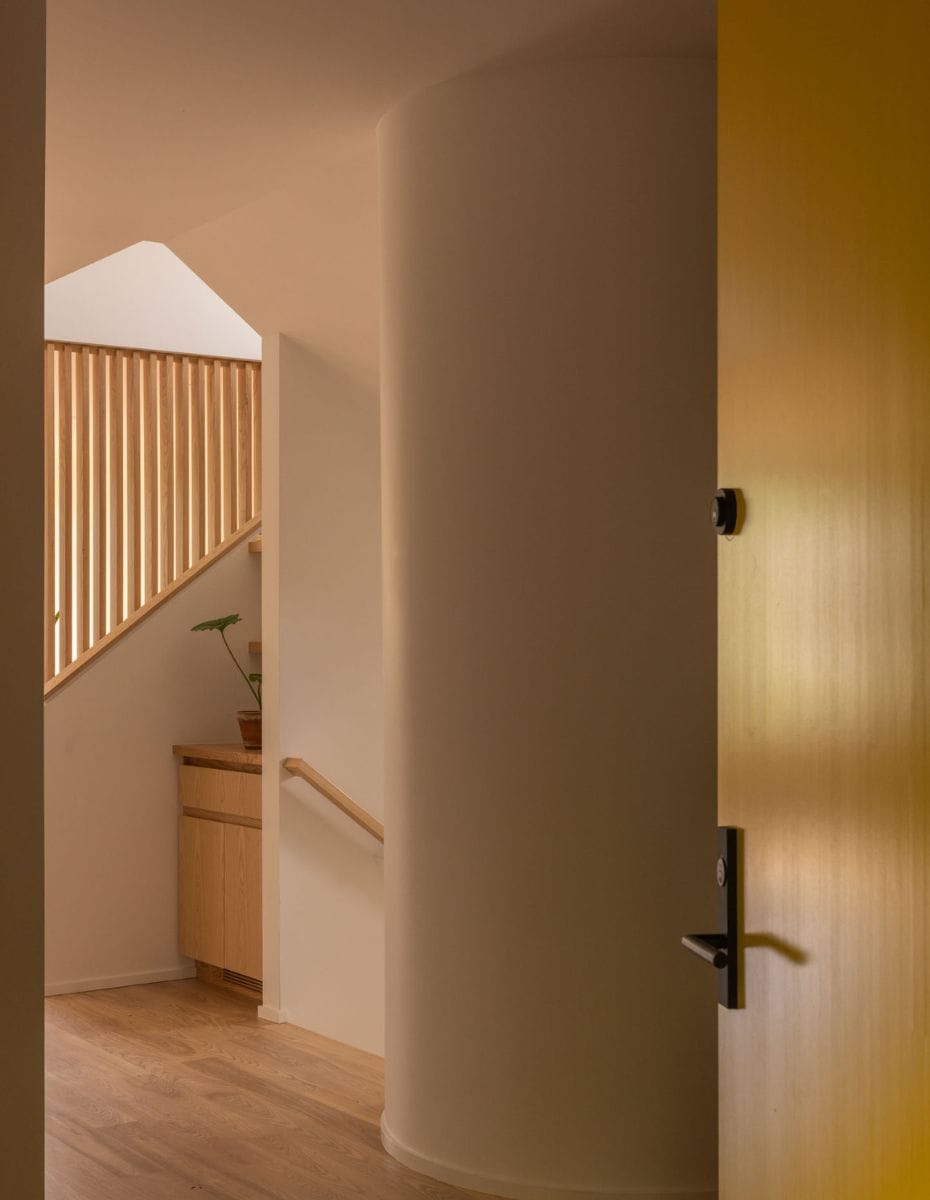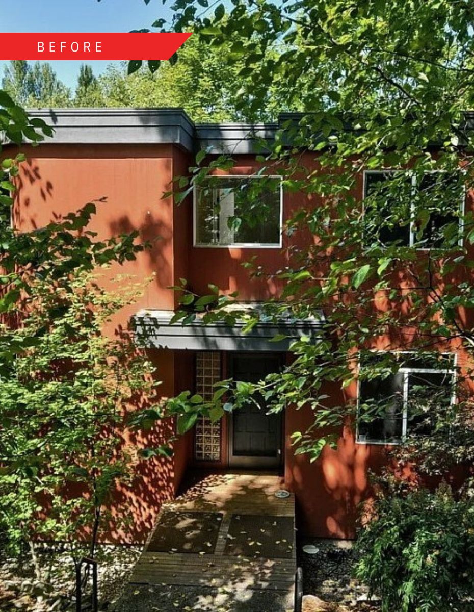 Originally built in 1990, the 2,820-square-foot structure featured bright red cladding, curved walls, gridded window compositions, and tiered cornices emblematic of post-modern design. The remodel blends contemporary updates with custom ash built-ins to unify interiors, maximize space, and improve functionality.