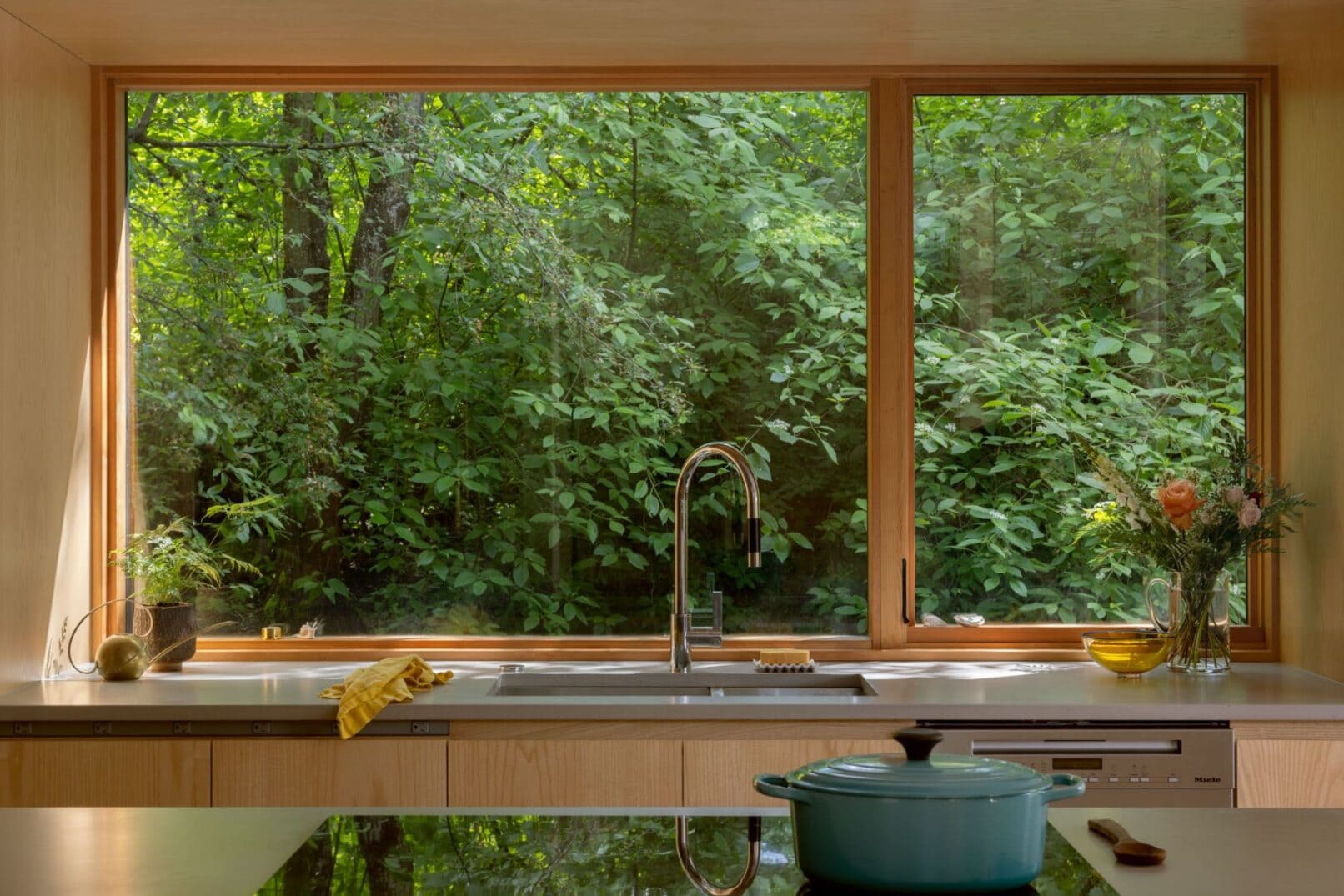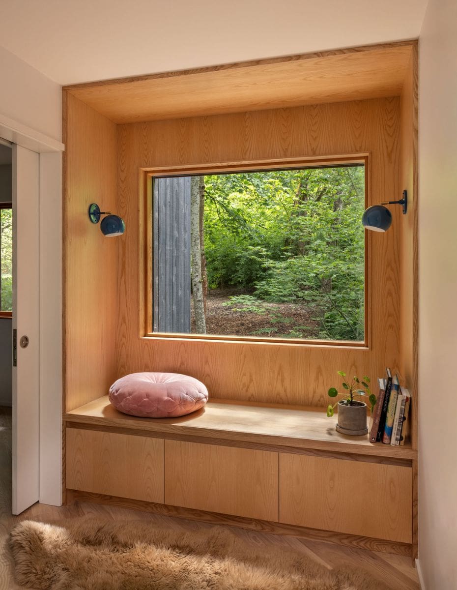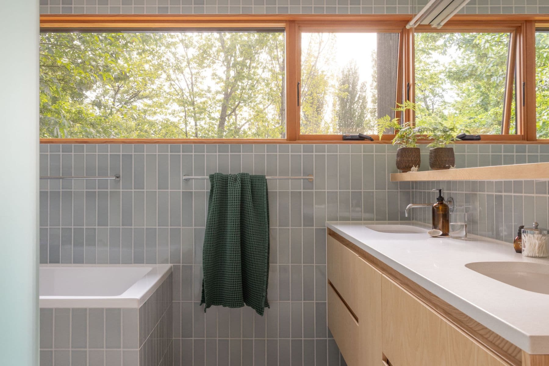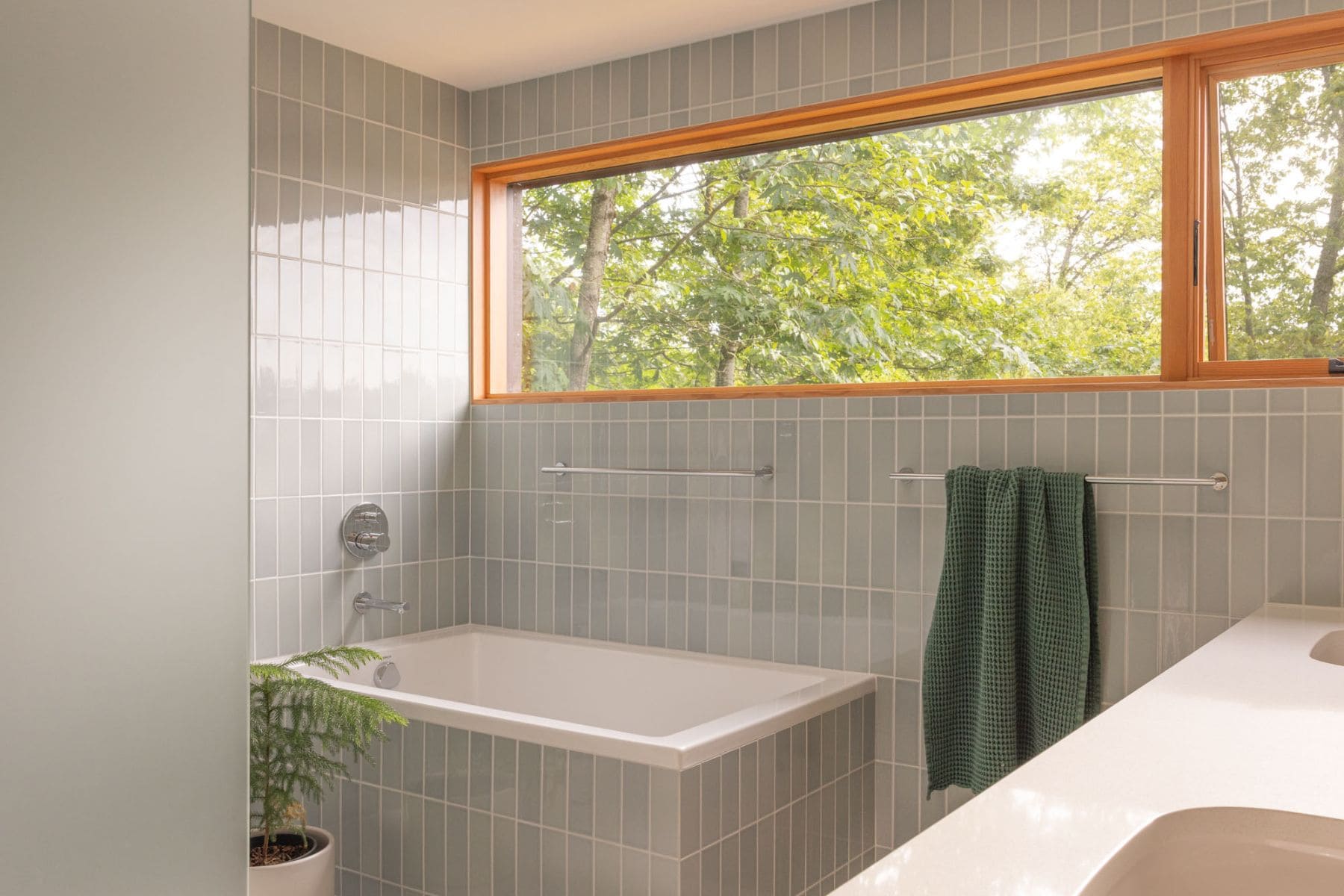 The primary suite was transformed for greater privacy and reoriented to frame views of the surrounding poplars. New ribbon windows, vertical tile, and built-in storage introduce a modern aesthetic while maintaining functionality. Crisp detailing throughout and floor-to-ceiling tile, casework, privacy glass, and mirror emphasize verticality and expansion.