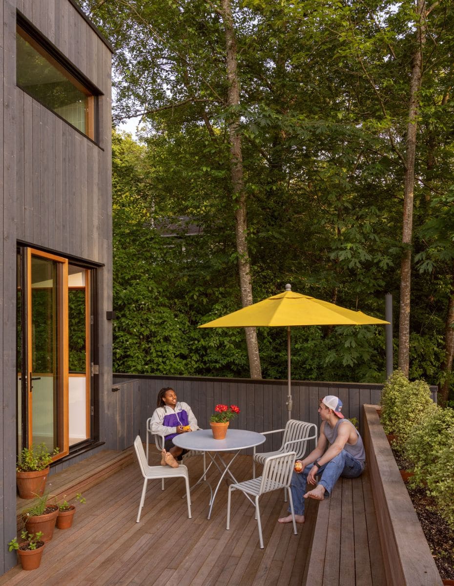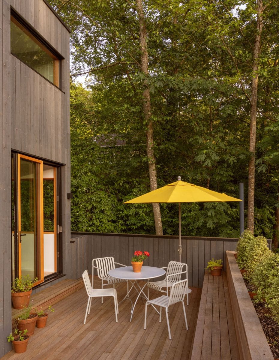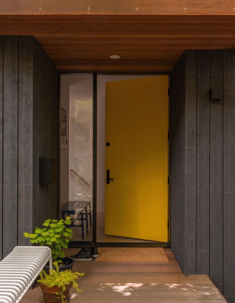 On the exterior, the cornice was removed to clarify the volumetric expression. The open-gap cedar cladding and COR-TEN accents nod to the natural, weathered materials at The Sea Ranch. The redesigned deck incorporates a custom COR-TEN planter and bench detailed to add privacy, providing a social space that extends the interior’s connection to the forested garden below.