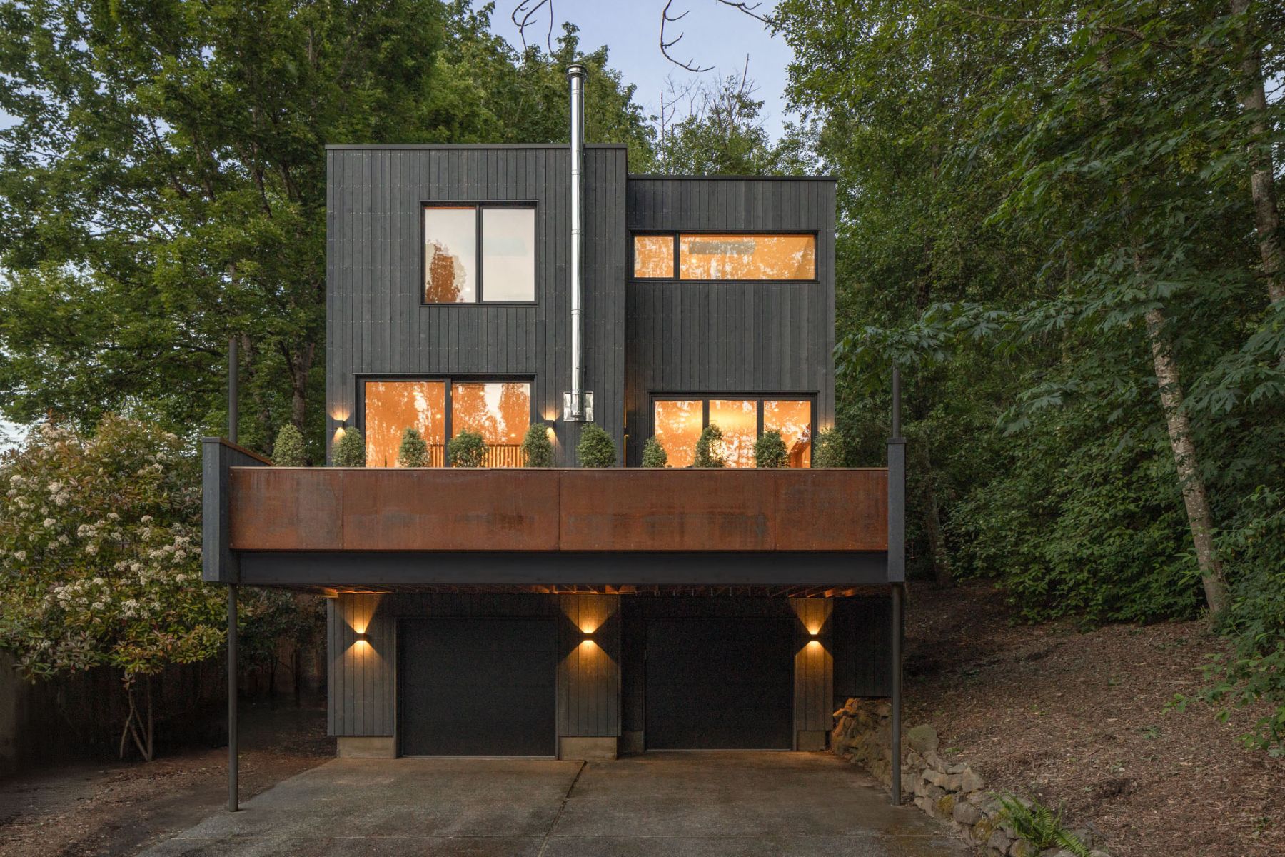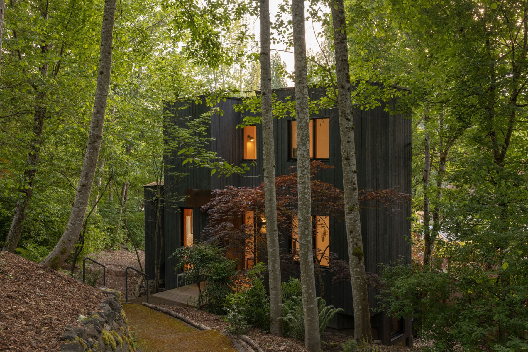 Set on a sloping lot in Seattle, the house is surrounded by clusters of alder trees and mature poplars. From the east, an oblique path winds through the trees to an elevated deck that bridges the ground and the front porch. Natural light filters through the dense greenery to the south. The ground slopes westward, exposing the lower level garage entrance accessed via the alleyway.