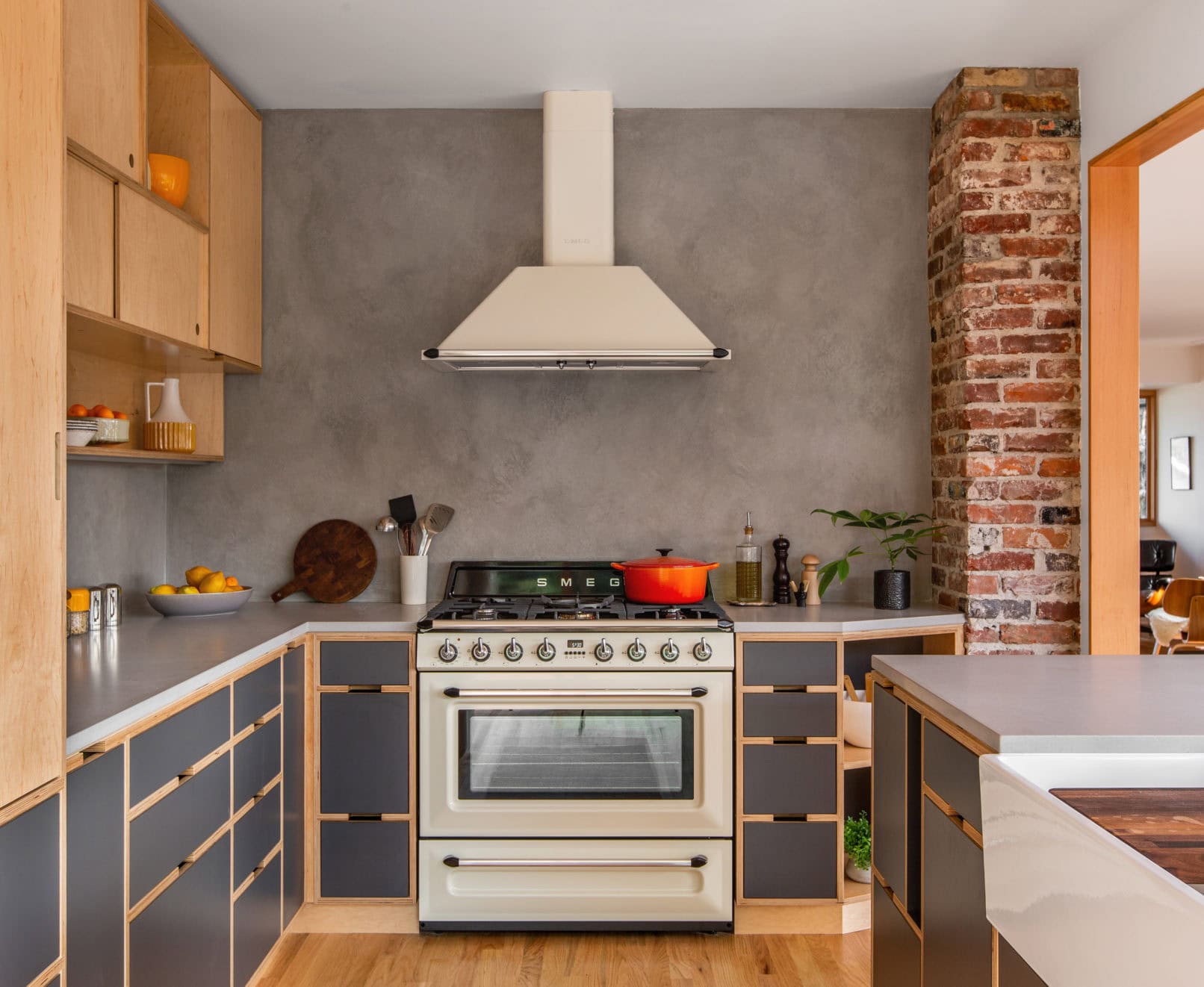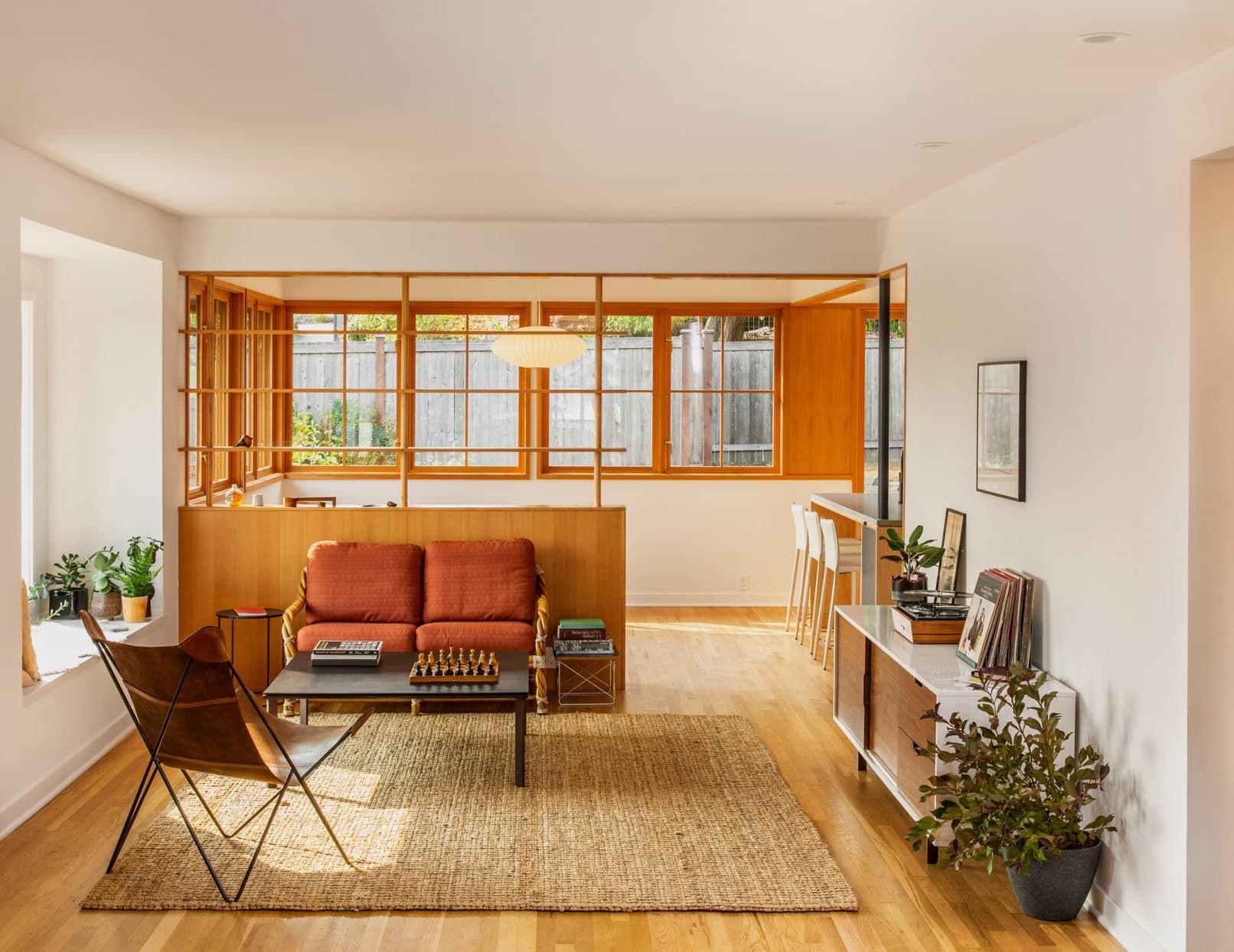 As is common with workforce housing of the era, the house was a simple rectangle comprised of compact and separate rooms ill-suited to contemporary living. Moreover, several additions had carved up and further separated the living, kitchen, and dining rooms. The team joined them, both visually and spatially by replacing walls with a screen and casework. In place of bearing walls, a strategically placed column anchors a new cooking island and pins the three spaces together through a necessary structural element. The result is visual permeability throughout the house, from front to back and yard to yard, while also bringing light into the house throughout the day. This also solved for a second central goal of the homeowners, which was to better connect the home to both its front and rear yard.