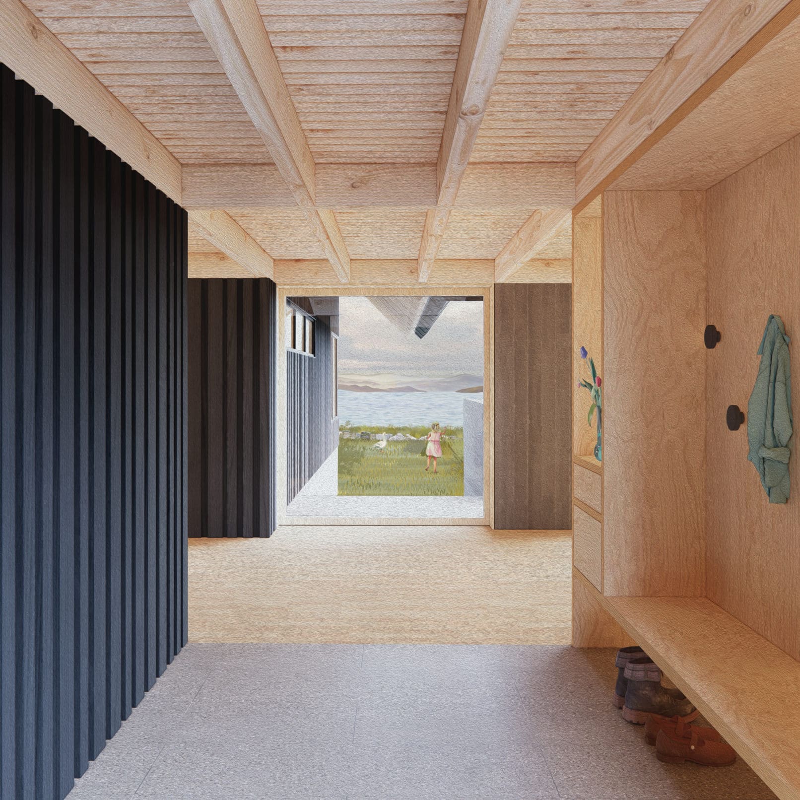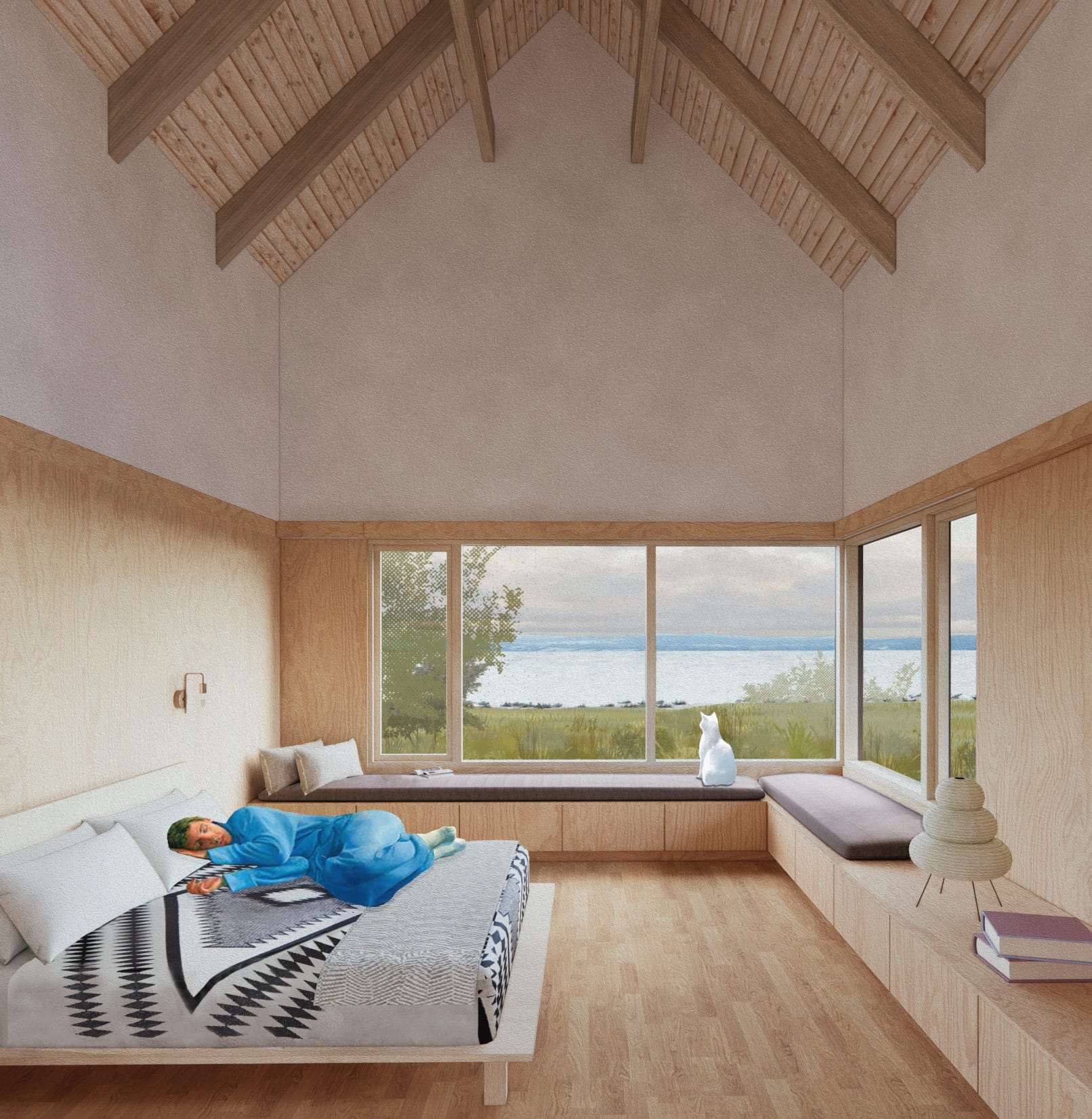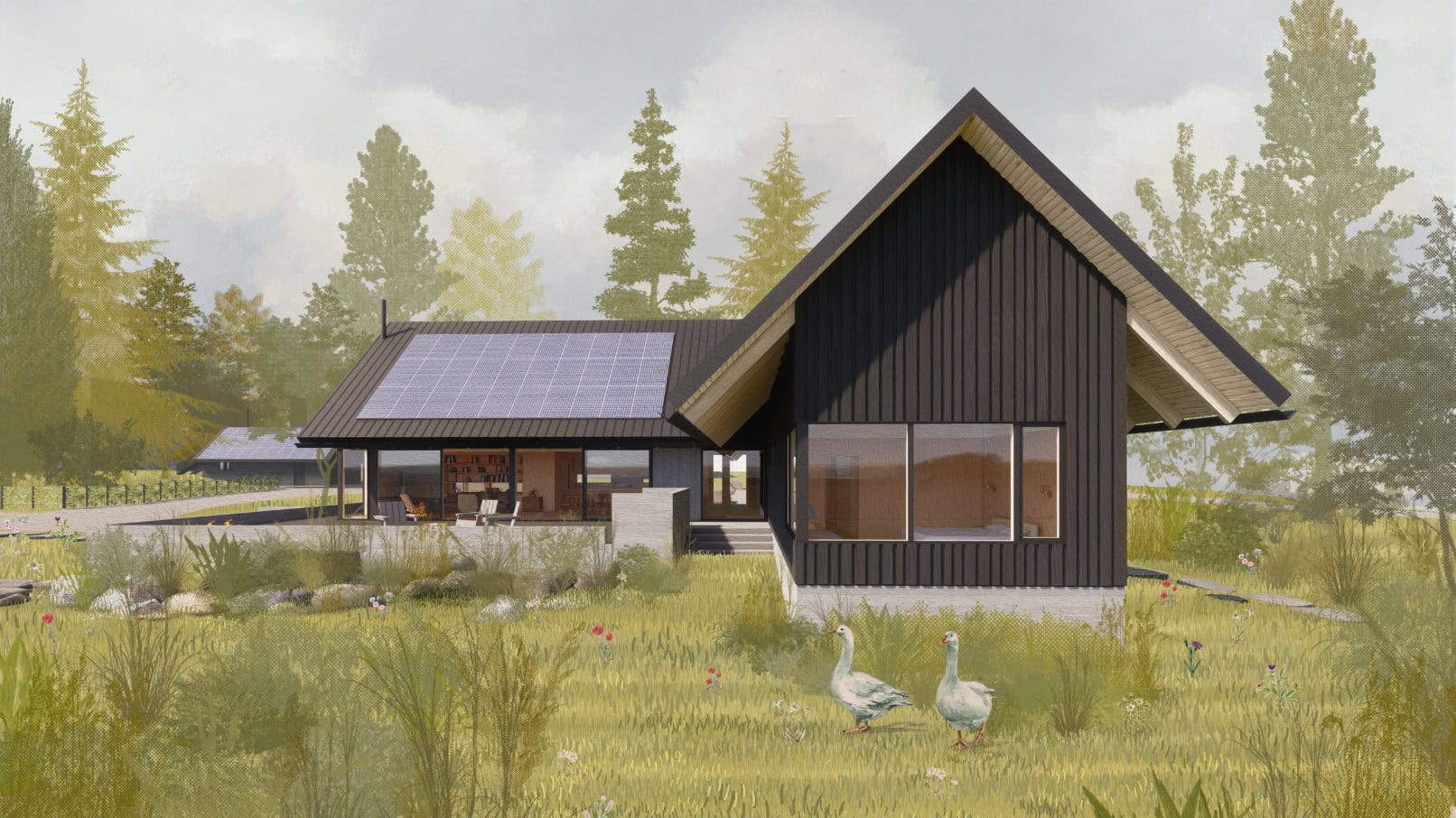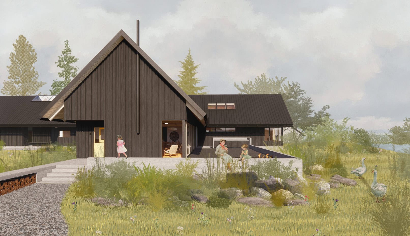 Preview of the main house of a family compound located on Dyes Inlet. The structure’s strong gable forms are reminiscent of Scandinavian farmhouses and define outdoor space while relating to the renovated guesthouse. Intended to embrace its waterfront site, the home is designed for aging in place, high-performance energy targets, and the use and enjoyment of a large extended family.