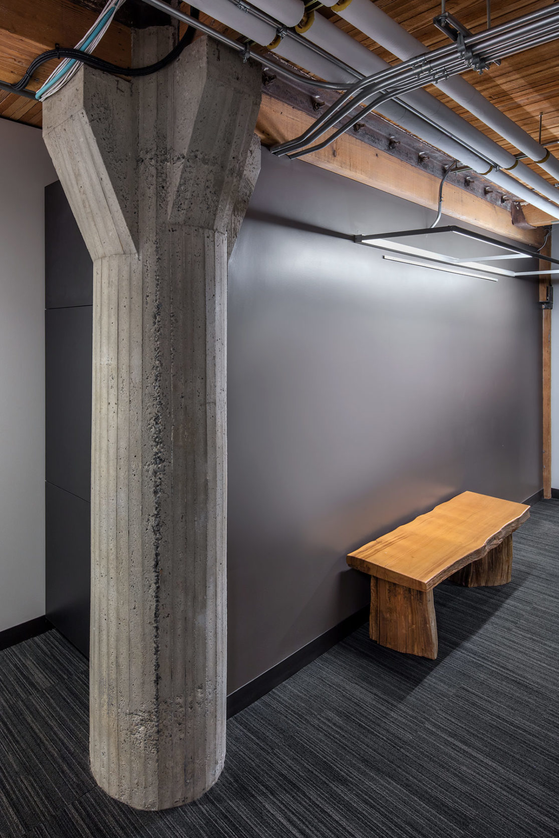 By meeting with the city early in the process, we were able to negotiate a reduced scope for the seismic retrofit work, saving a considerable amount of resources. We coordinated a greatly simplified structural design with the engineer and coordinated the addition of a parking level in the basement, a new elevator, and large rooftop deck. The interior was stripped back to the original heavy timber and concrete finishes, with new core containing bathrooms, elevator and storage for a future tenant improvement.