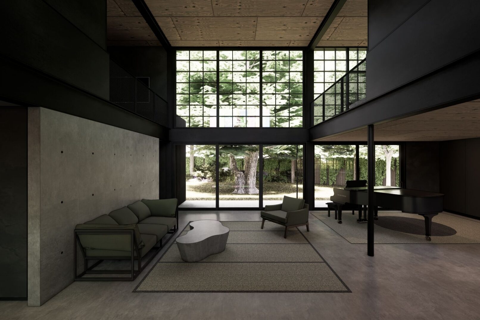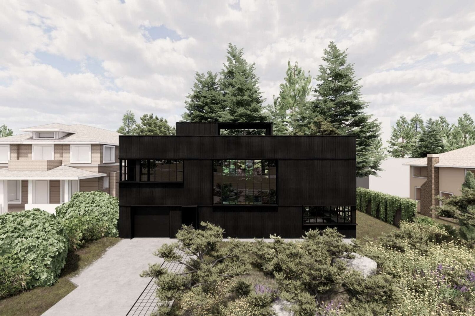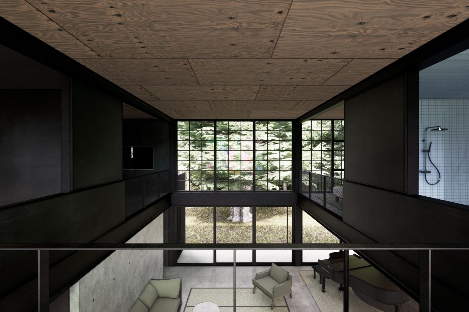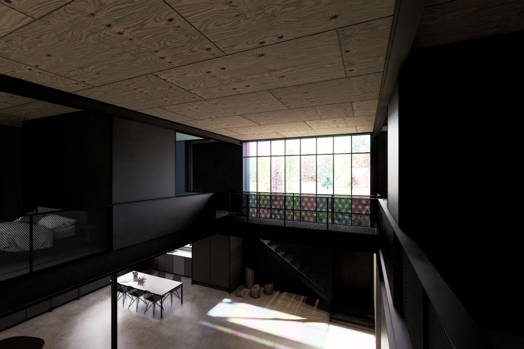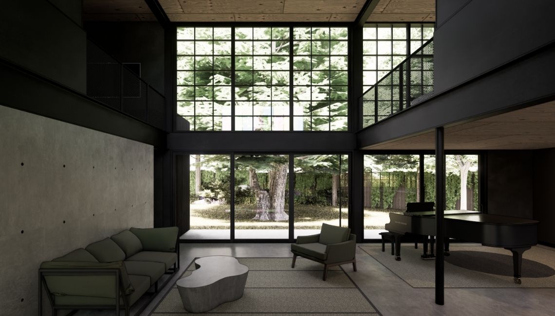 The design responds to a grove of cedar trees in the backyard, with a central double-height space connecting northern views to a multicolored paned window to the south that fills the interior with light. Concrete floors and a steel frame define the interior, while a rooftop deck opens to views of downtown Bellevue and the surrounding treetops.