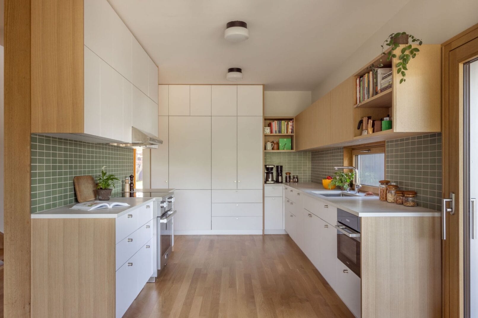 The street-facing roof forms were inspired by the Swiss Alps, with a shed roof enveloped by another to create a hip roof at the northwest corner. The upper shed roof, facing south, can accommodate solar panels and conceals a private deck. The lower shed roof, responding to the scale of the neighborhood, shelters a welcoming front porch, which faces the neighborhood and encourages social interaction.