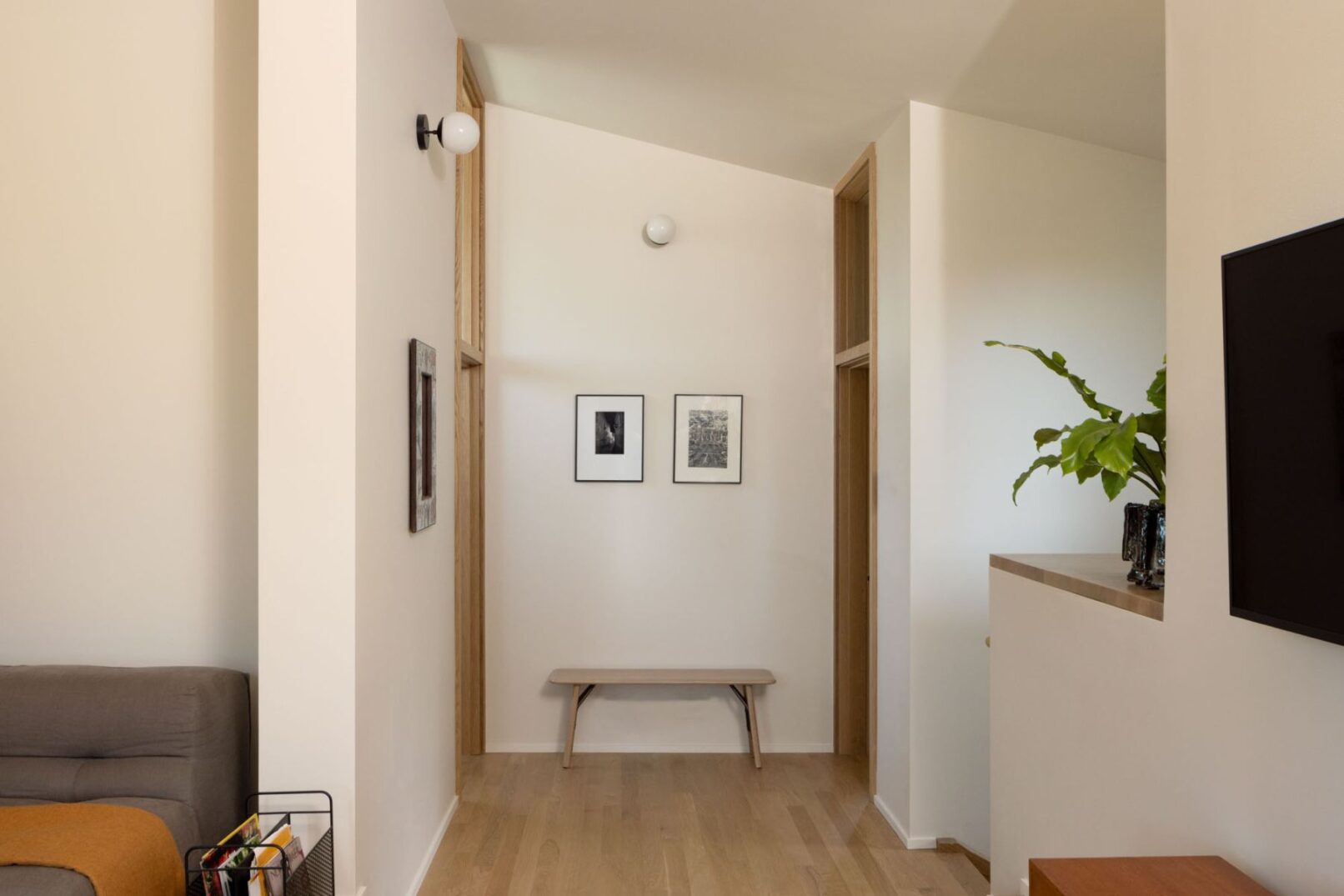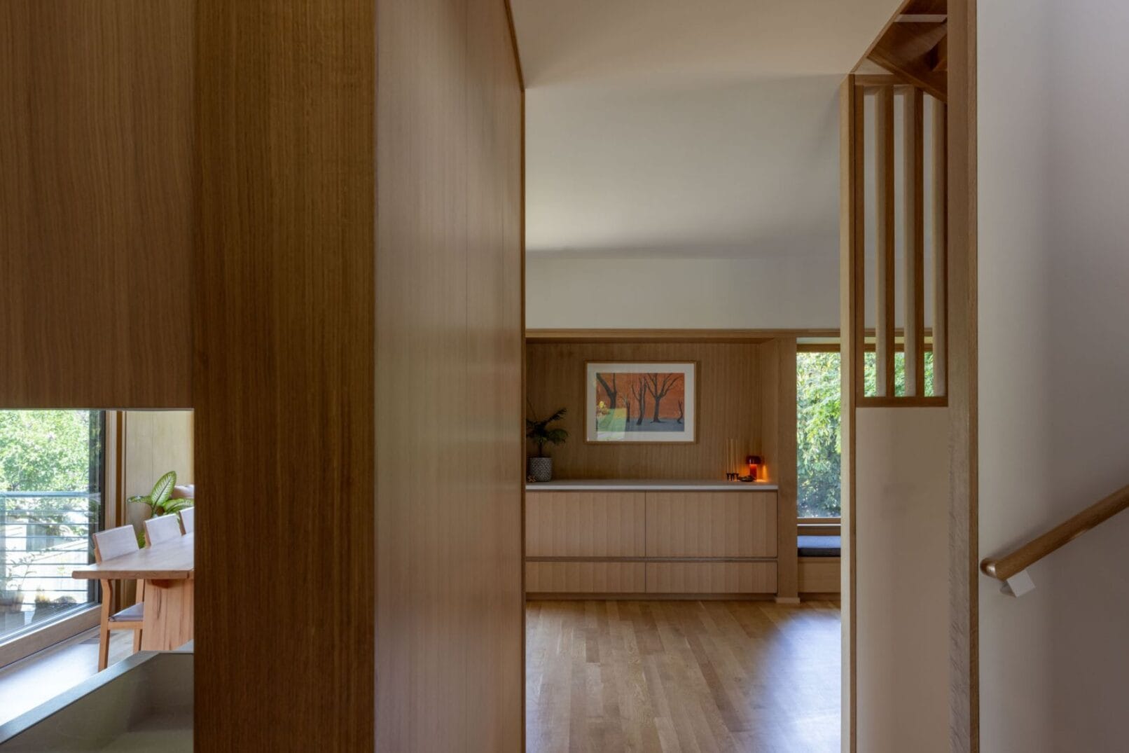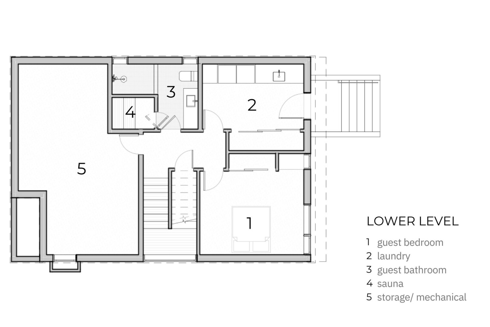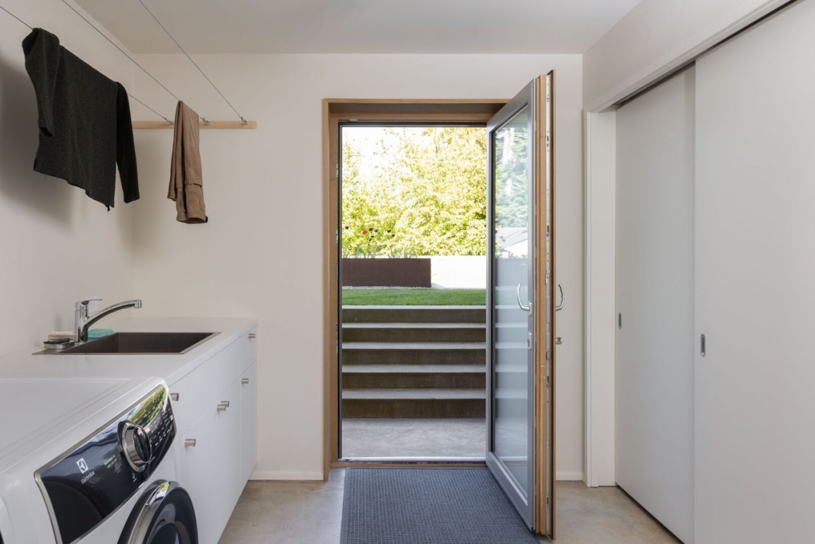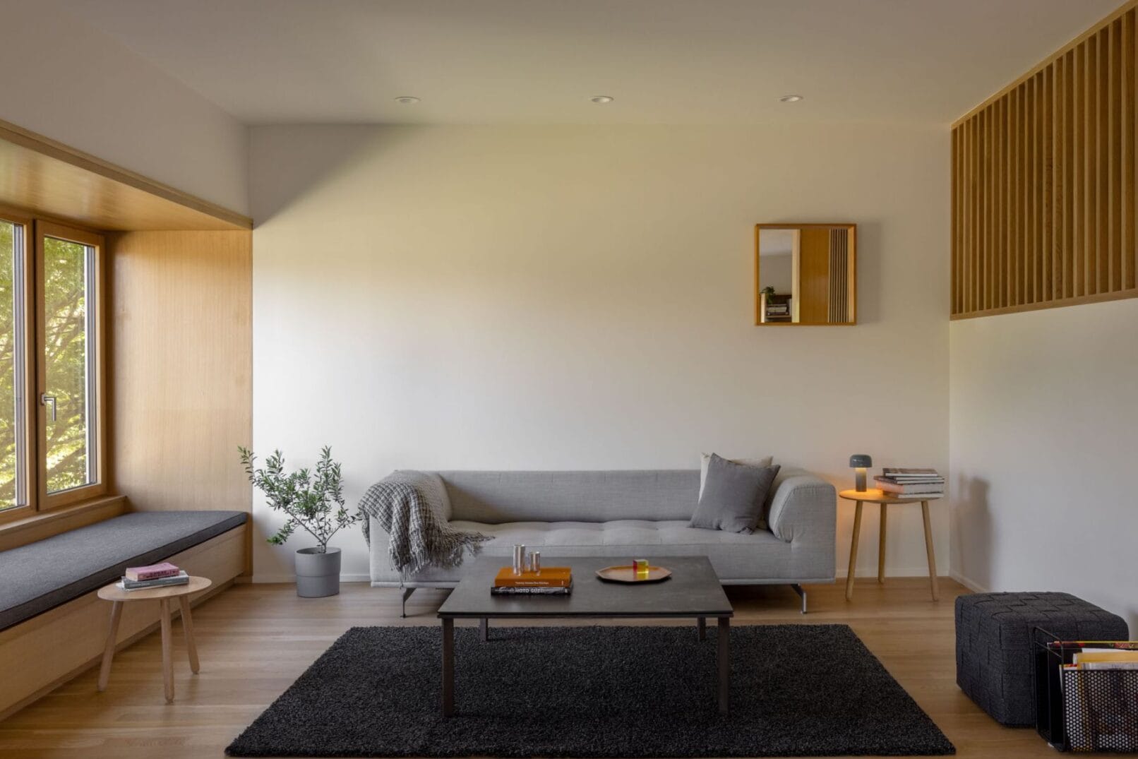 The three-level home’s main level features an entry and office facing the street, with living, kitchen, and dining areas facing east. The east-facing rooms provide garden views from large window seats and easy access to the backyard and north patio for summer dining and outdoor activities. The lower level contains a guest suite, a bathroom with a sauna, laundry, utilities, and storage. The existing foundation was reused, and the entire house was lifted to create 8′ basement ceilings. The upper level has a primary suite and a west-facing upper living room that opens onto a private deck with Olympic Mountain views. The home’s exterior features wood siding and a metal roof, reminiscent of Swiss barns and mountain structures, and elemental materials are used throughout to create a minimalist palette.