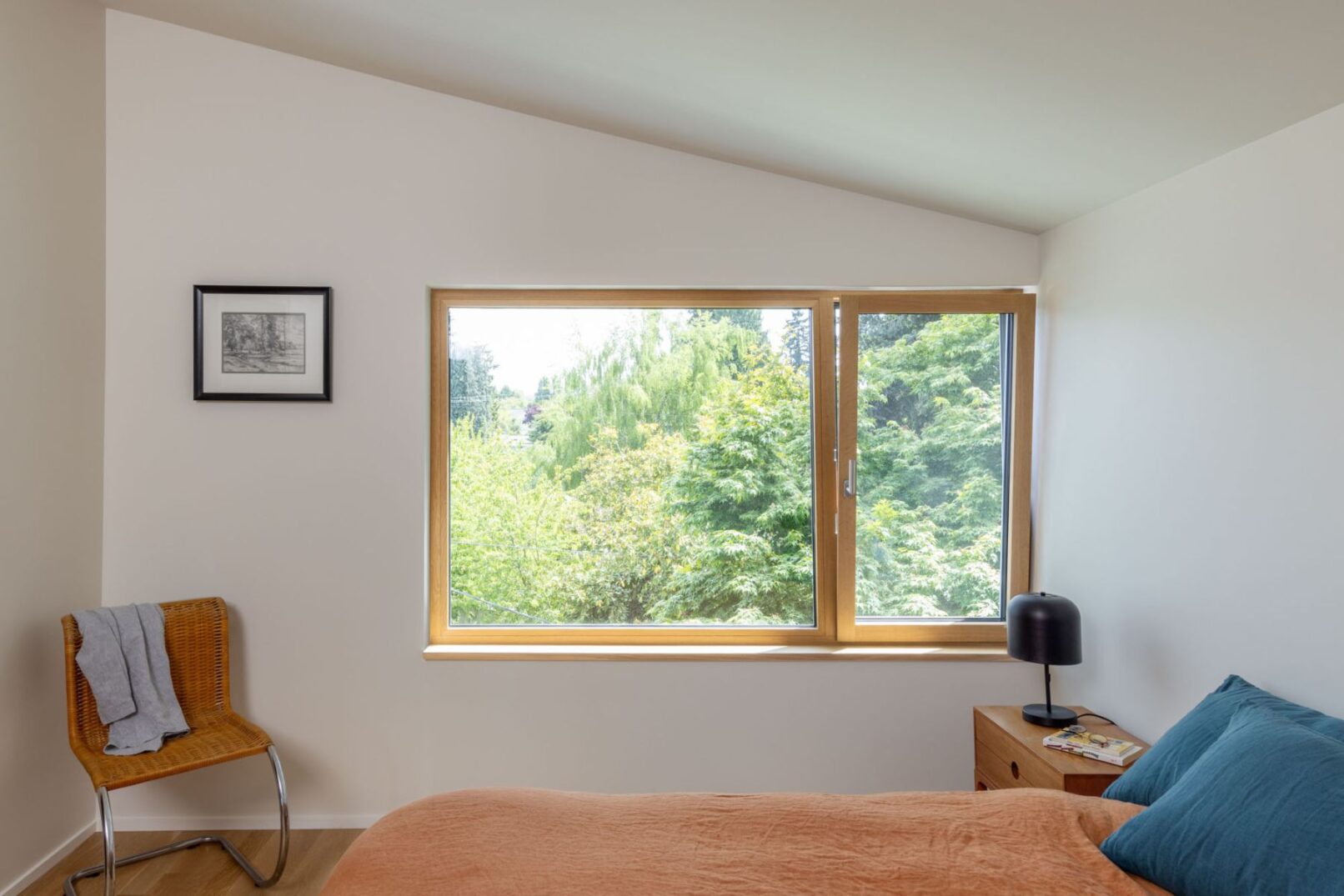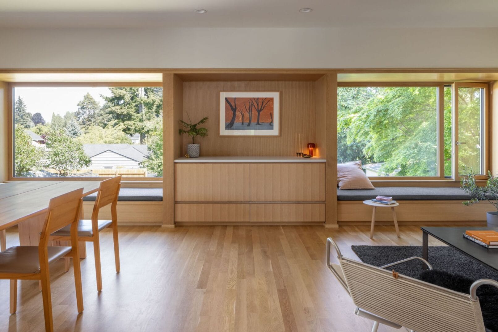 The interior is both warm and minimal, with large windows framing views of the surrounding garden and Olympic mountains. Clad entirely in wood, it is a contemporary chalet in the Pacific Northwest.
