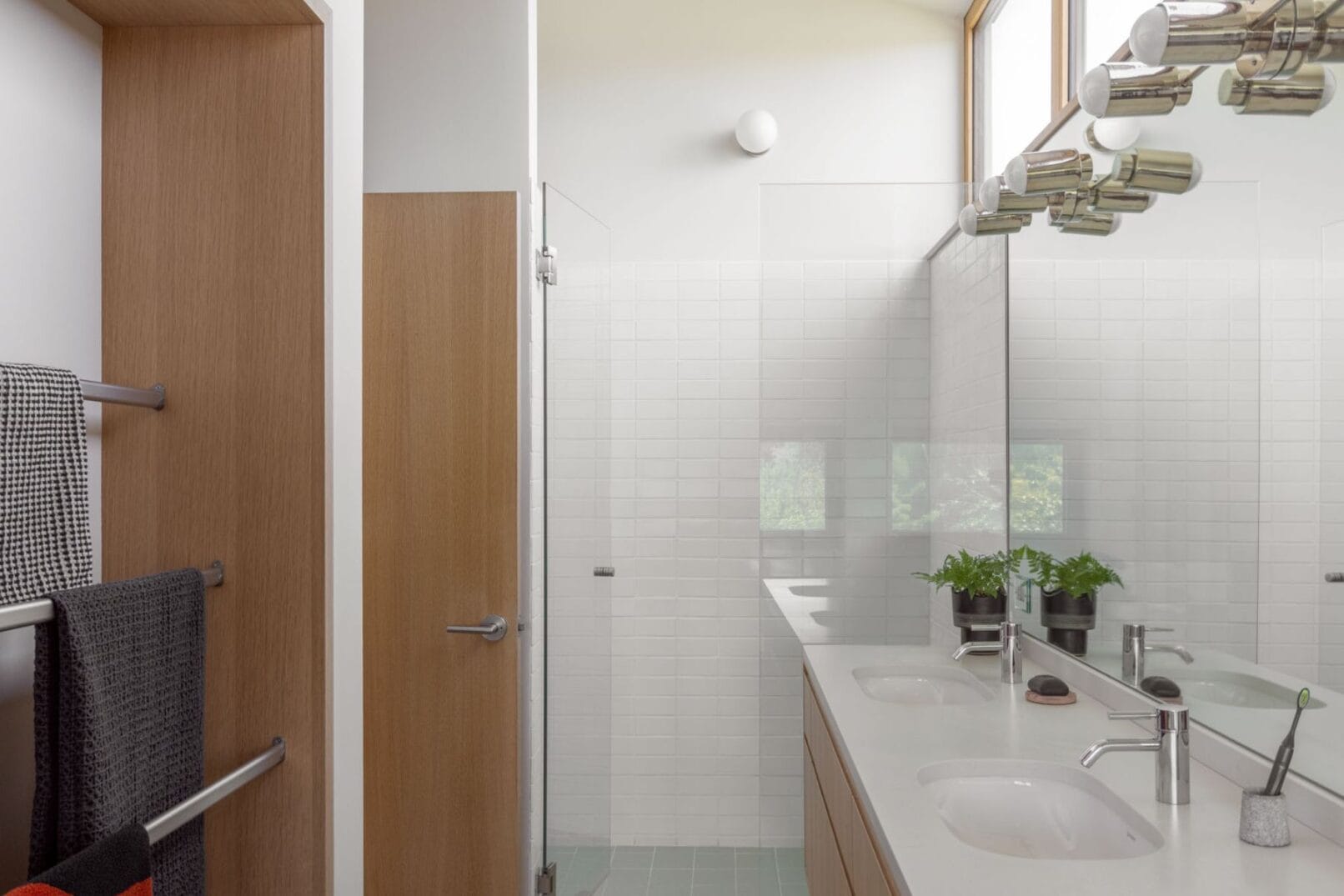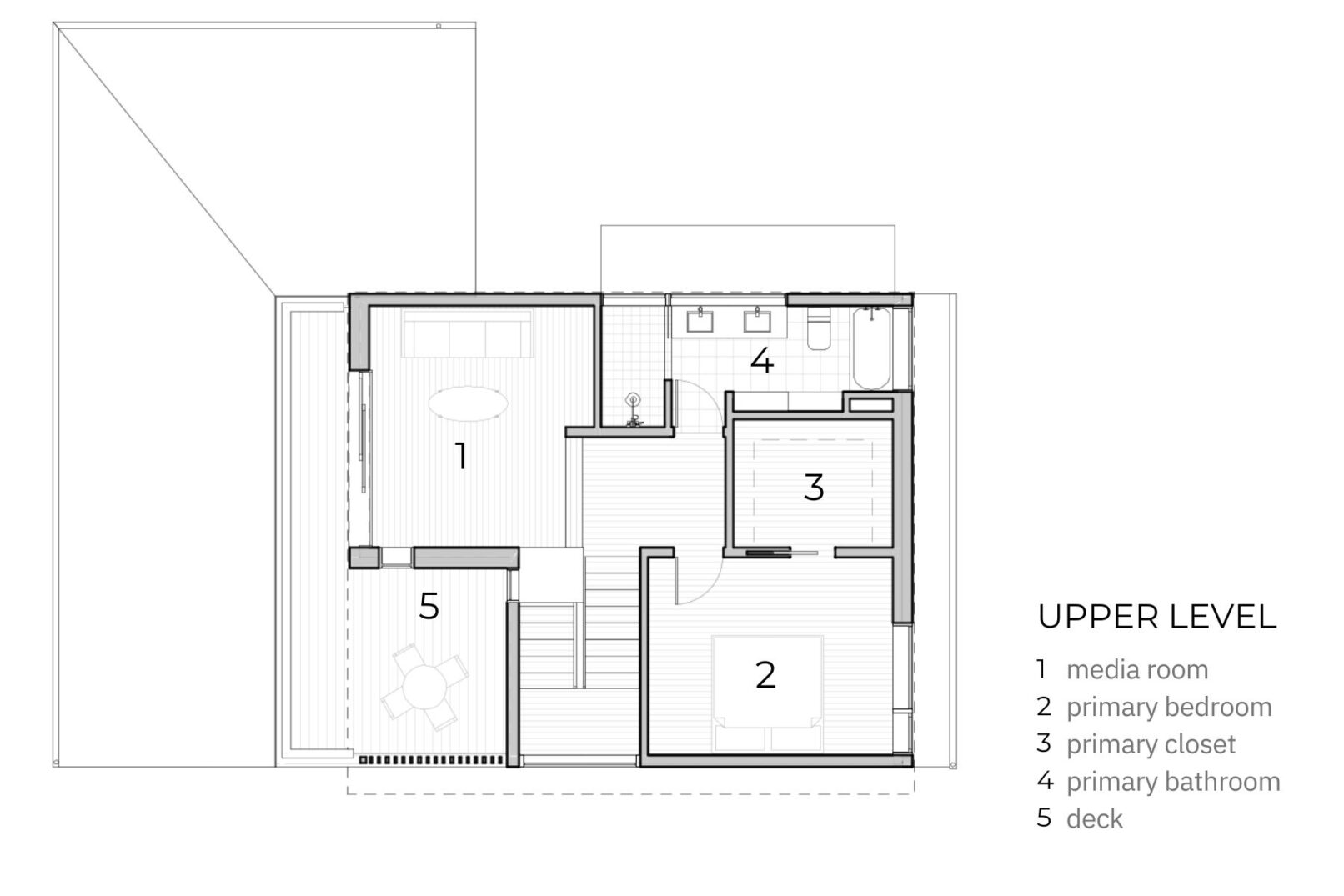 The owners’ love for their location and community was a major factor in their decision to remain on the property. Their vision for the new house included street-facing elements designed to encourage interaction with neighbors and private living spaces at the back of the house to provide garden views and backyard access. The upper level was designed to function as a primary suite with a sitting area and access to a deck with views of the Olympic Mountains.