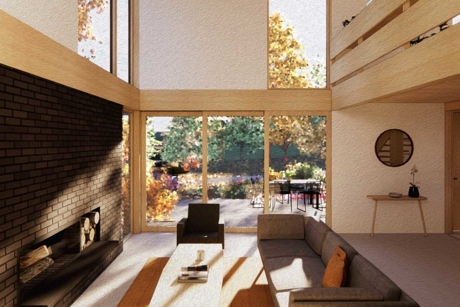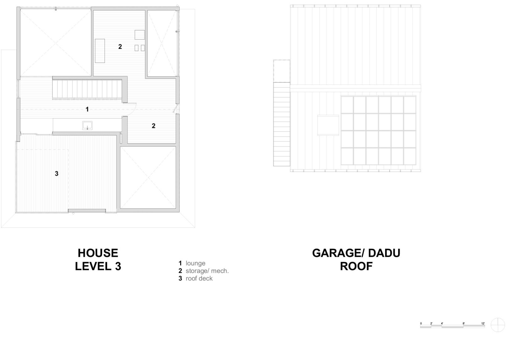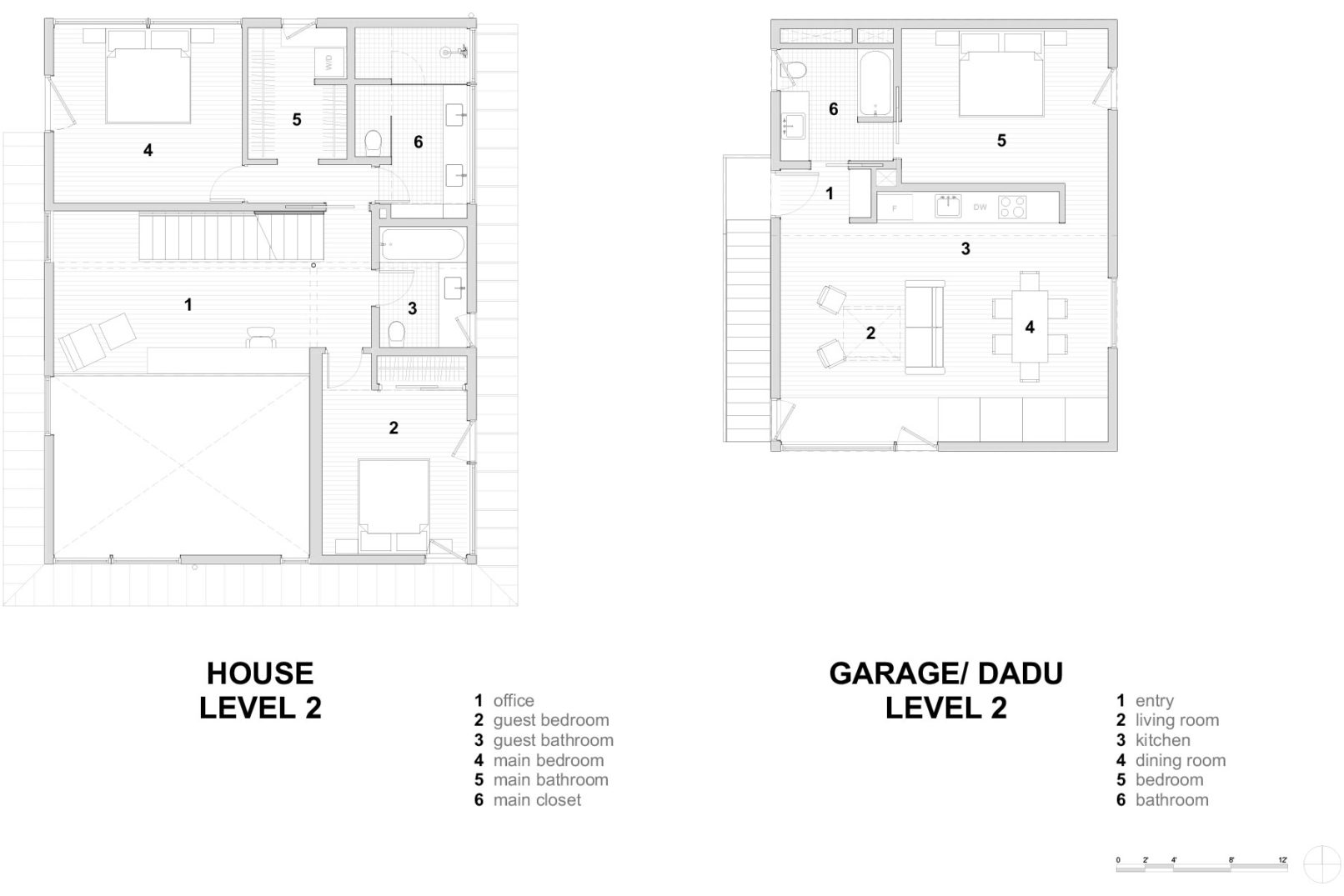 The house is designed around a double-height space oriented to the west, with an interior stair that ascends to a roof deck featuring territorial views of the Olympic mountains. The DADU is accessed from the central courtyard and sits above a large garage that opens to the alley. The monopoly houses are clad in Shou Sugi Ban siding and create a lush garden compound scaled to the neighborhood and designed friendly to the street.